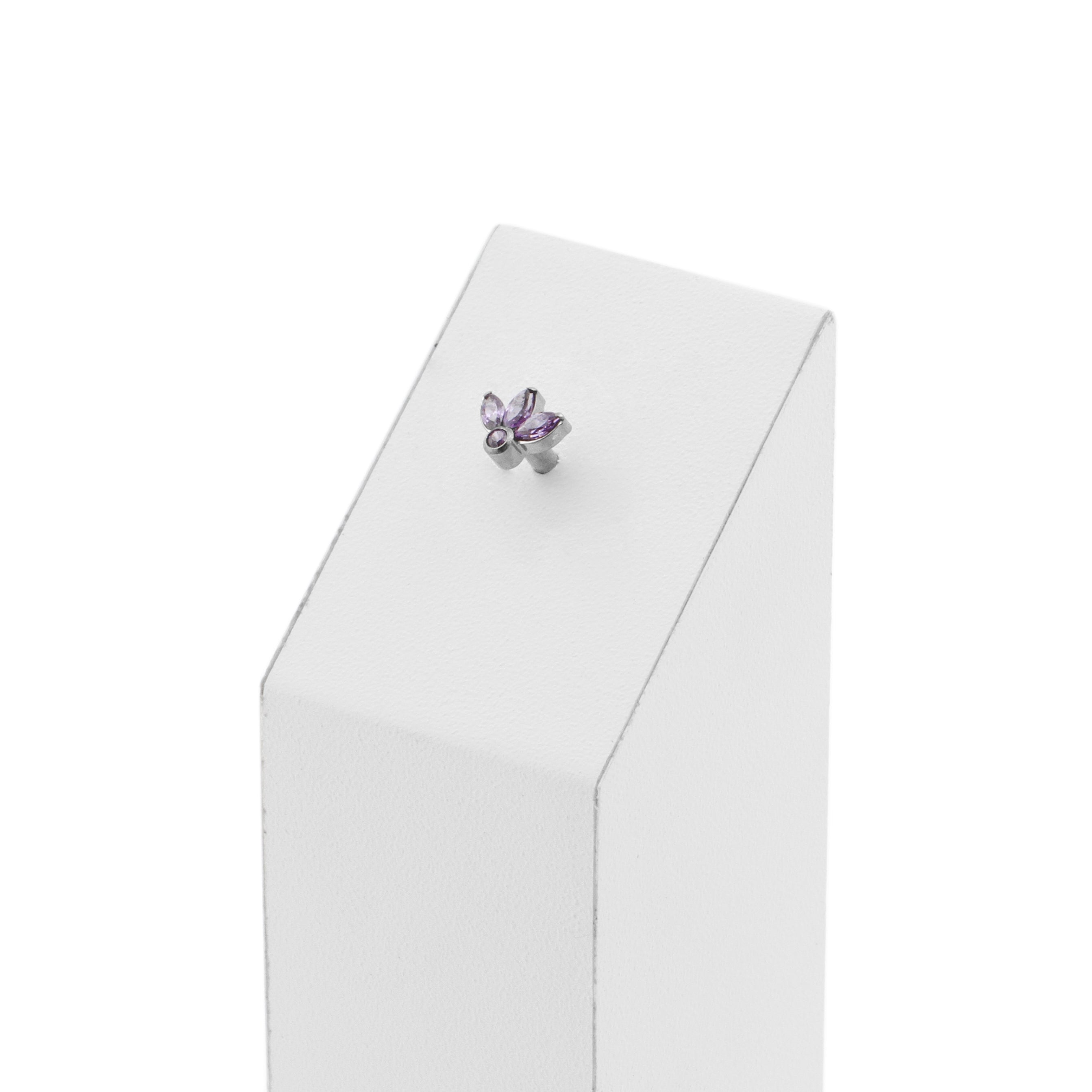 Titanium Zirconia Cluster Top - Purple instantly adds a stylish touch to your piercing. This Threadless Top is made of Titanium with a cubic zirconia in Purple. The threadless system allows you to easily combine this top with all our bars, which we call Threadless Base, for a perfect fit and ultimate comfort.