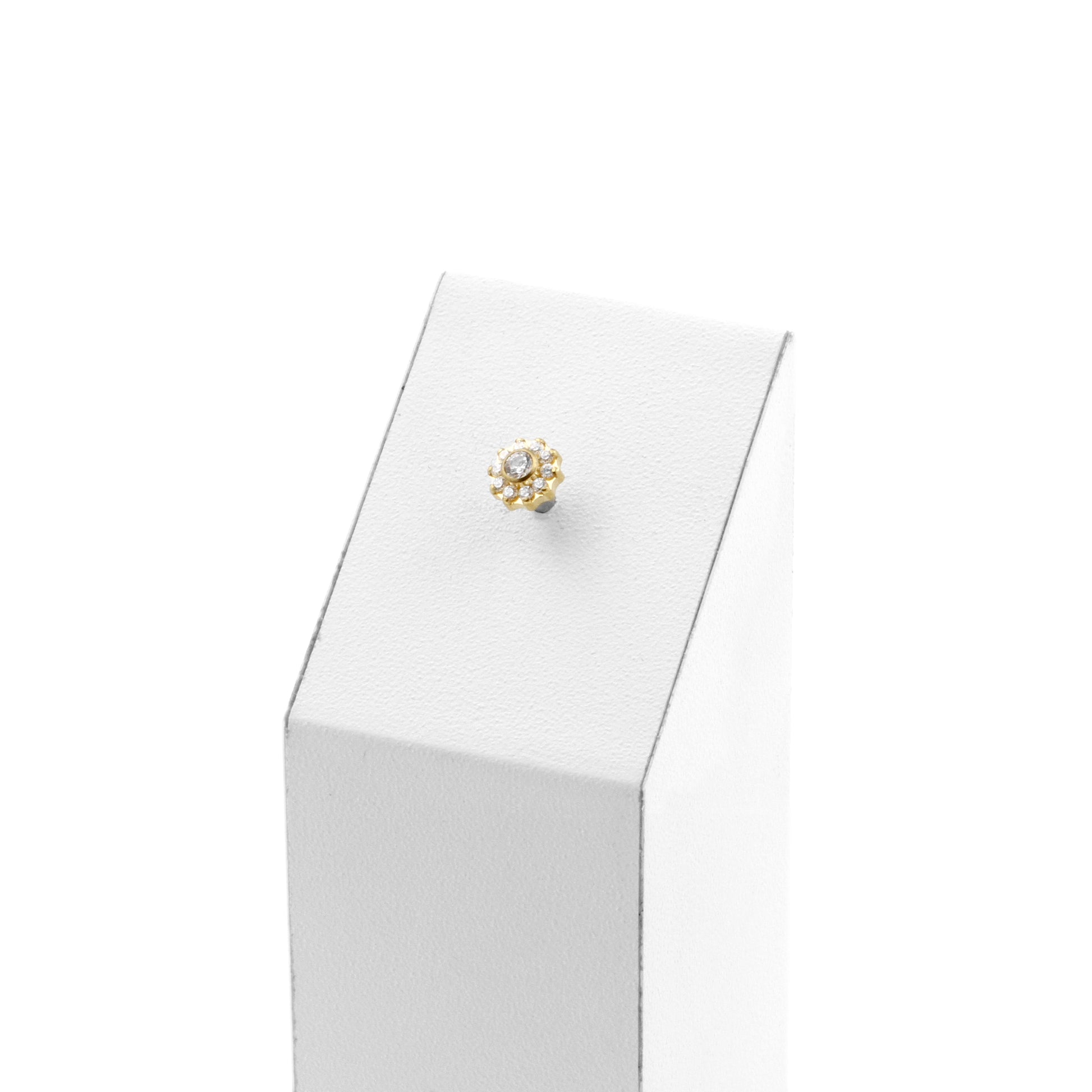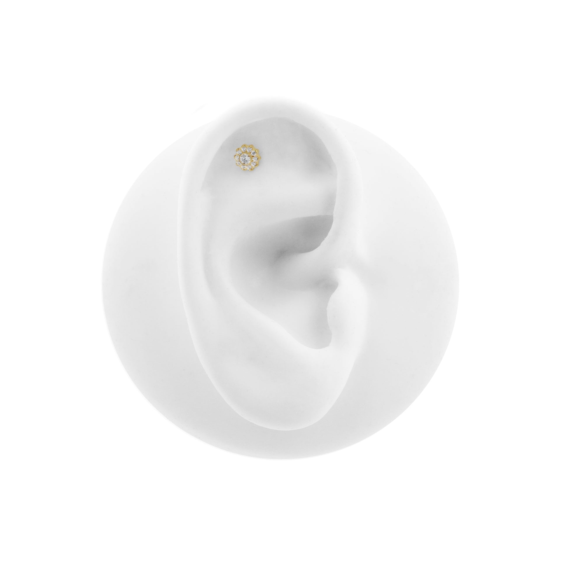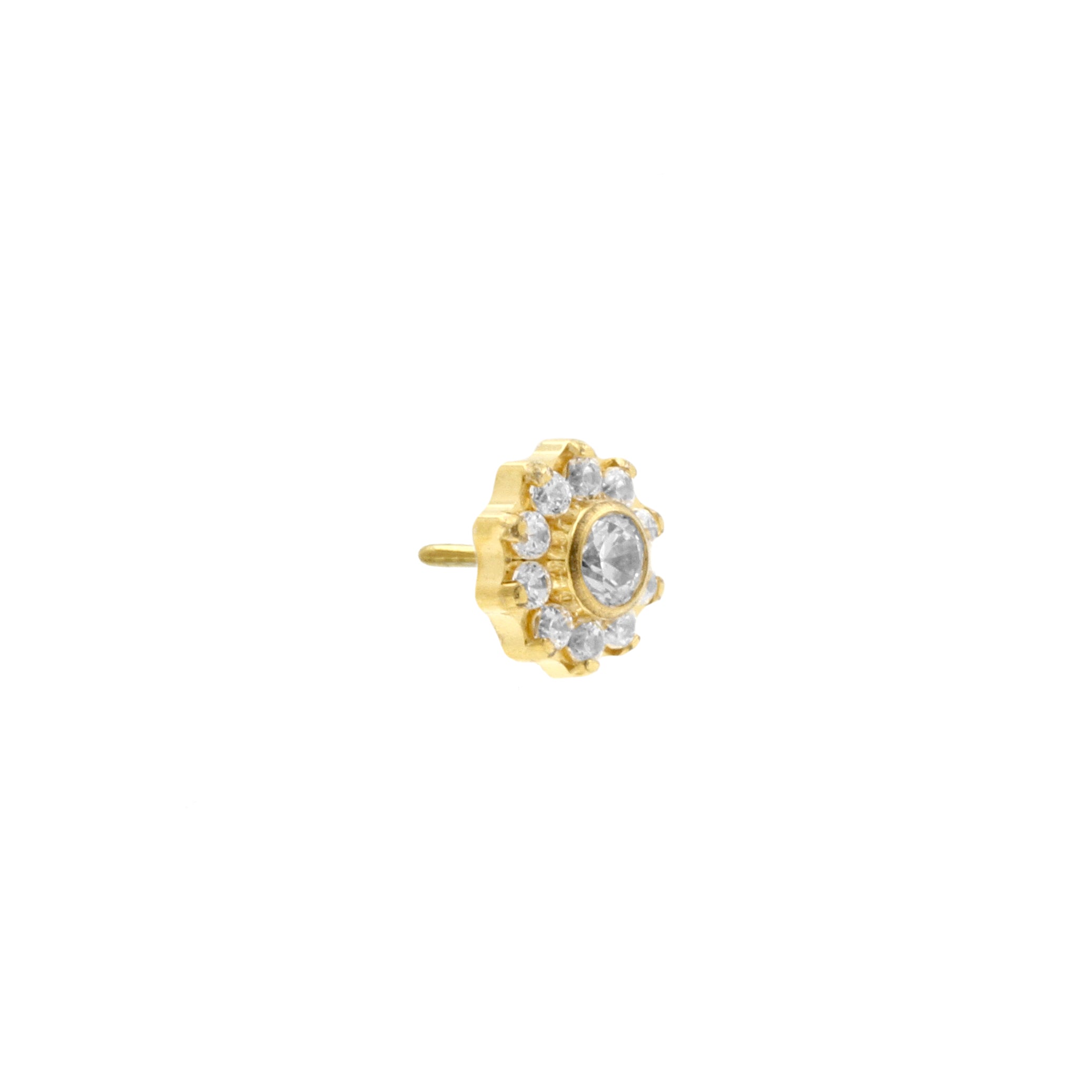 Titanium Zirconia Flower Cluster - Gold instantly adds a stylish touch to your piercing. This Threadless Top is made of Titanium with a cubic zirconia in Clear. The threadless system allows you to easily combine this top with all our bars, which we call Threadless Base, for a perfect fit and ultimate comfort.