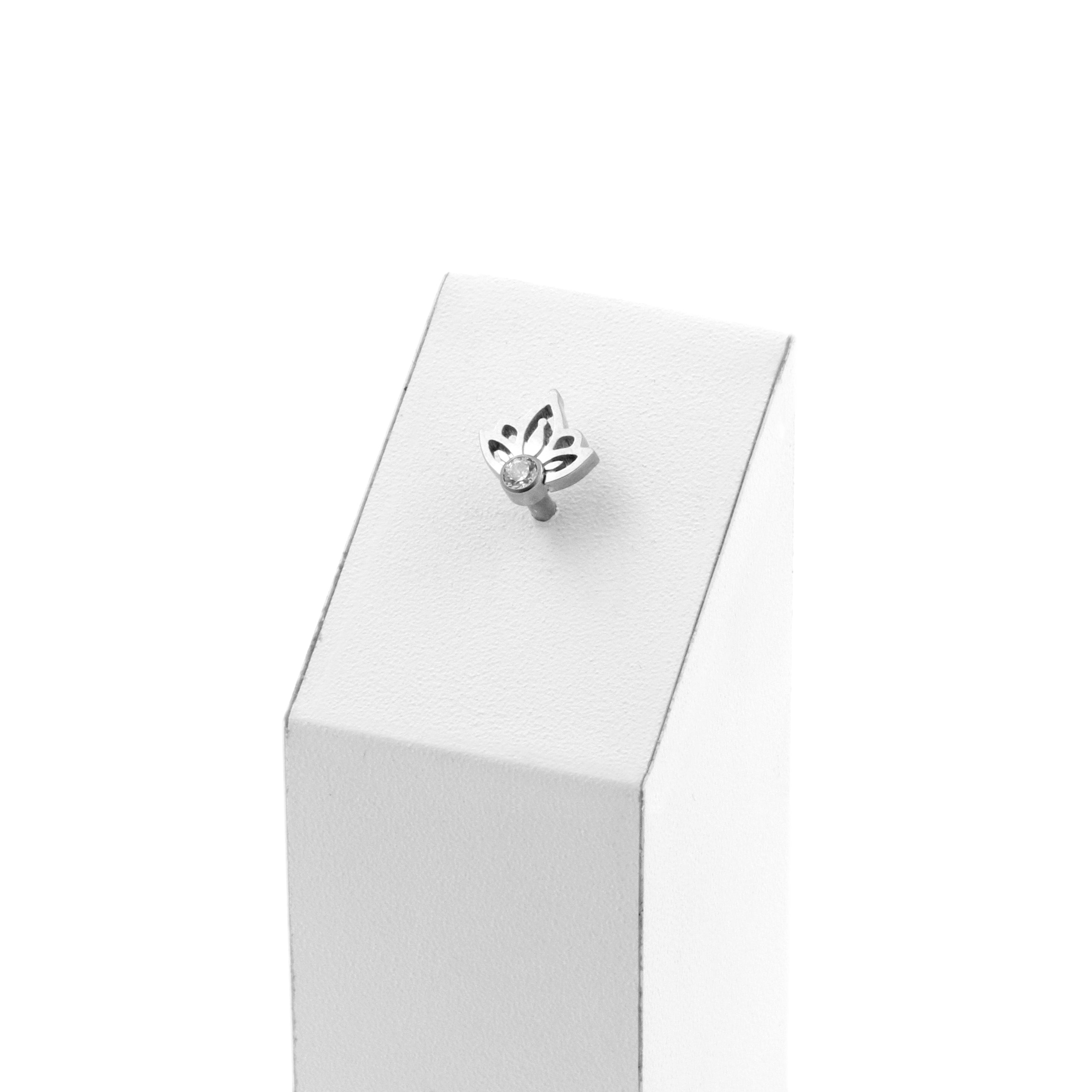 Titanium Zirconia Lotus - Silver instantly adds a stylish touch to your piercing. This Threadless Top is made of Titanium with a cubic zirconia in Clear. The threadless system allows you to easily combine this top with all our bars, which we call Threadless Base, for a perfect fit and ultimate comfort.