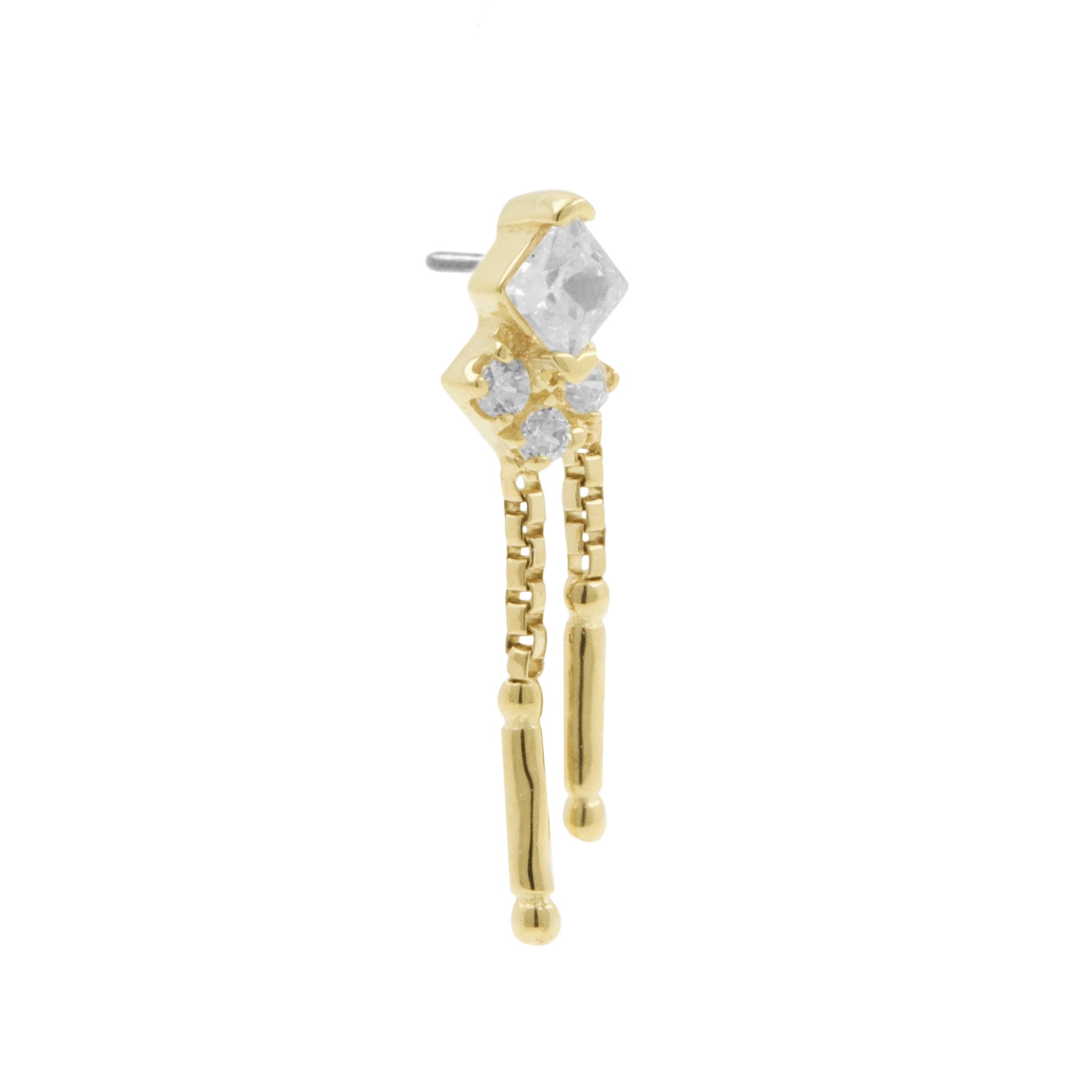14 Karaats Gouden Vierkante Zirkonia Stack Hanger – Threadless Top van 14 Karaats Goud met een cubic zirconia in de kleur Clear. Compatibel met alle Threadless Base staafjes en voorzien van een handig push/pull systeem zonder schroefdraad.