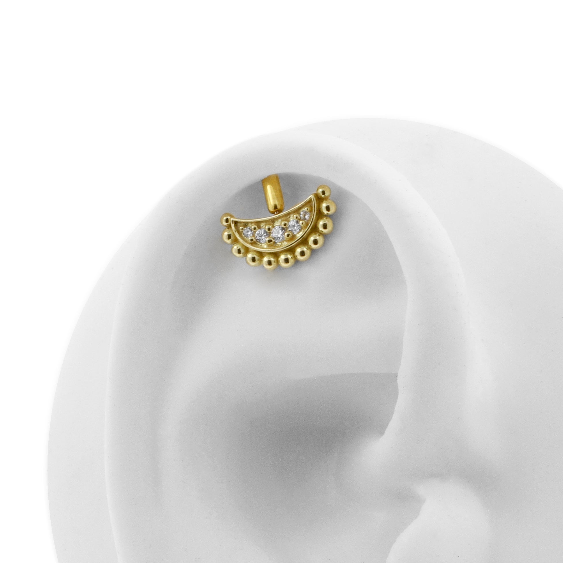 18 Karaats Goud Vertical Helix Moon Goud – Threadless Top van 18 Karaats Goud met een cubic zirconia in de kleur Clear. Compatibel met alle Threadless Base staafjes en voorzien van een handig push/pull systeem zonder schroefdraad.