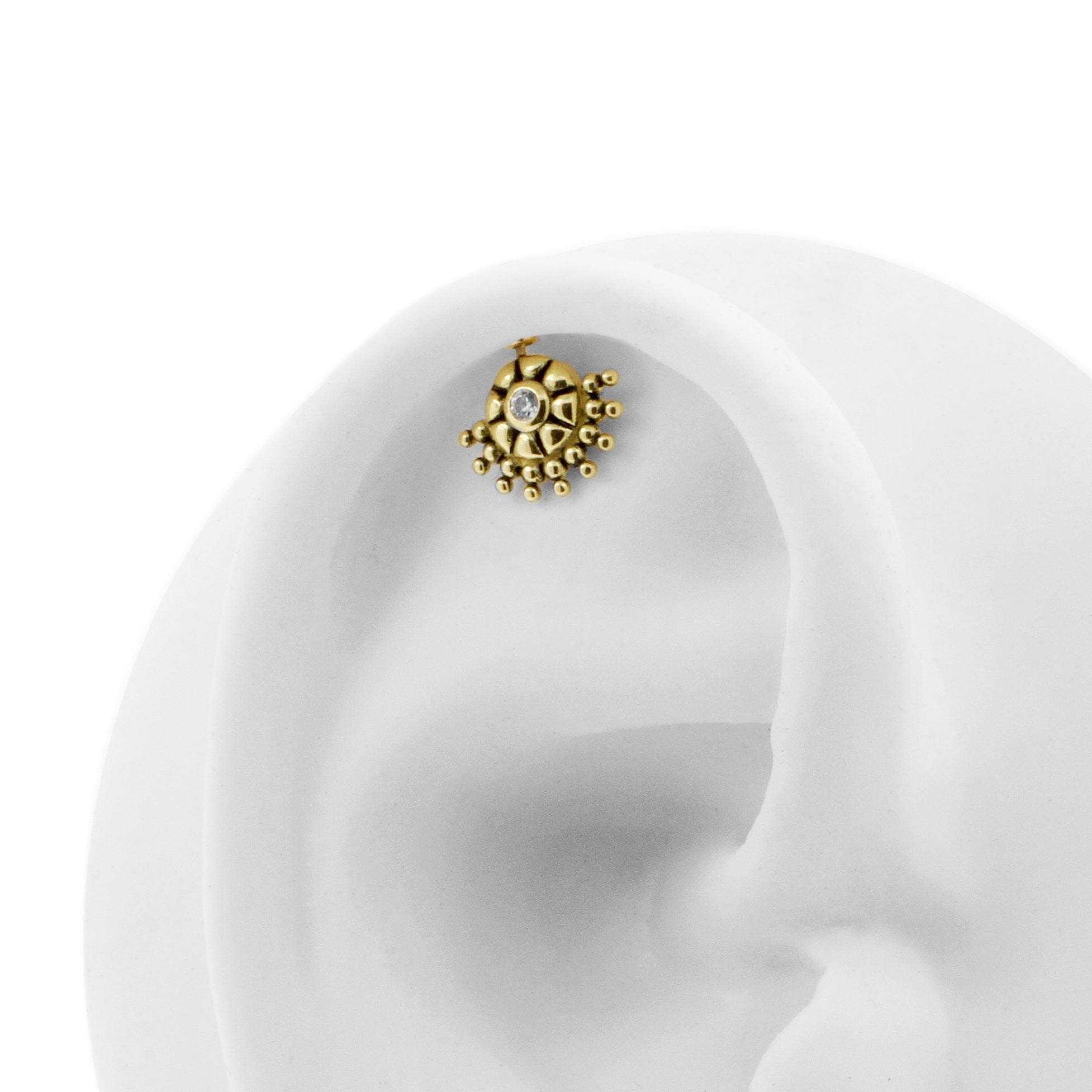 18 Karaats Goud Vertical Helix Wheel Goud – Threadless Top van 18 Karaats Goud met een cubic zirconia in de kleur Clear. Compatibel met alle Threadless Base staafjes en voorzien van een handig push/pull systeem zonder schroefdraad.