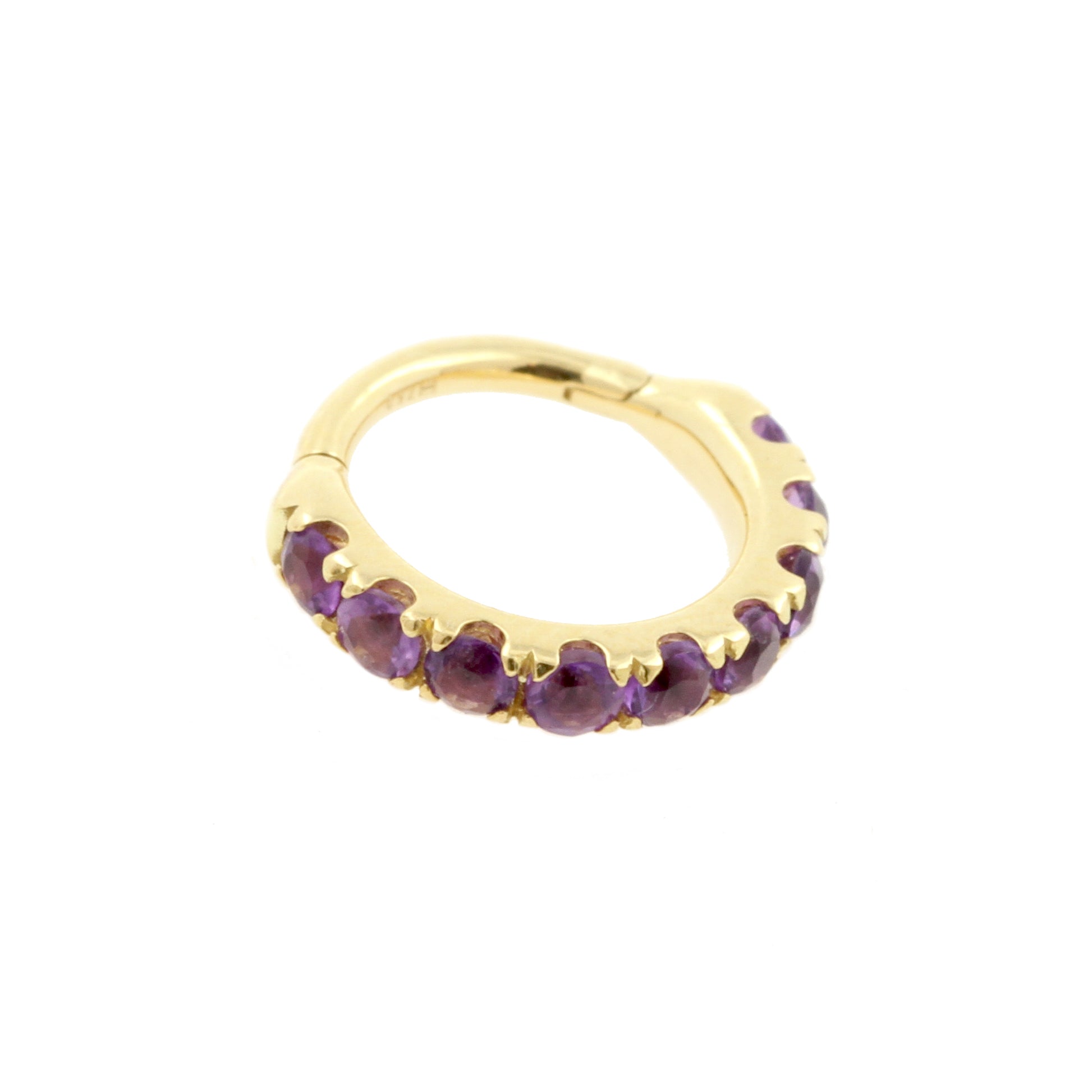Klik, en het zit! Mooie Click Ring voor je piercings, gemaakt van 18 karaats goud met prachtige versiering aan de onderzijde. De piercing clicker is ingezet met echte amethyst met een prachtige, dieppaarse kleur. Makkelijk in en uit te doen en supercomfortabel. Het segmentje in deze ring zit vast aan de ring en de ring heeft aan een zijde een scharnier. Je klikt hem zo open, doet hem in je piercing en klikt hem weer dicht. Done! De click ring is ideaal voor diverse piercings en staat fantastisch in oorpiercings!