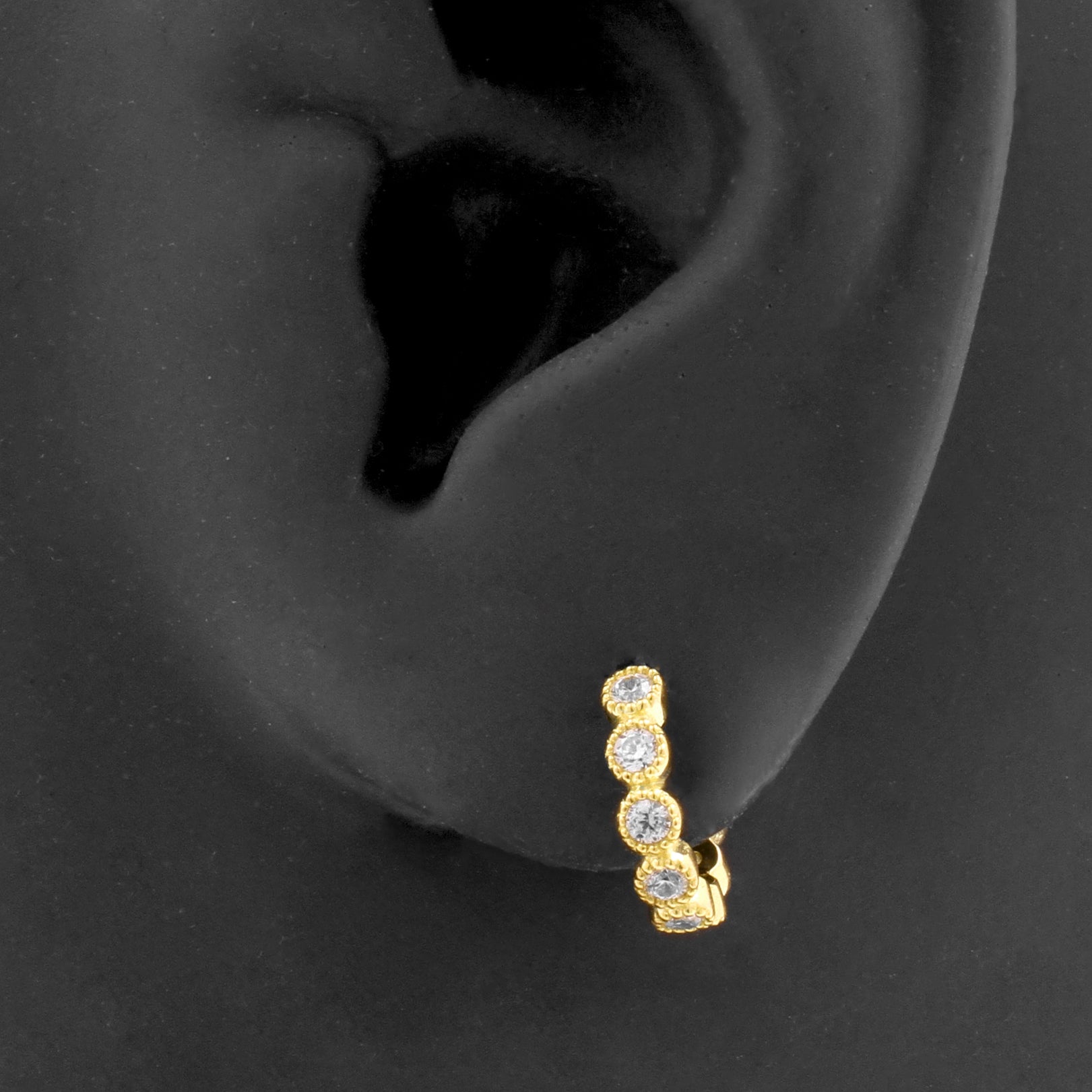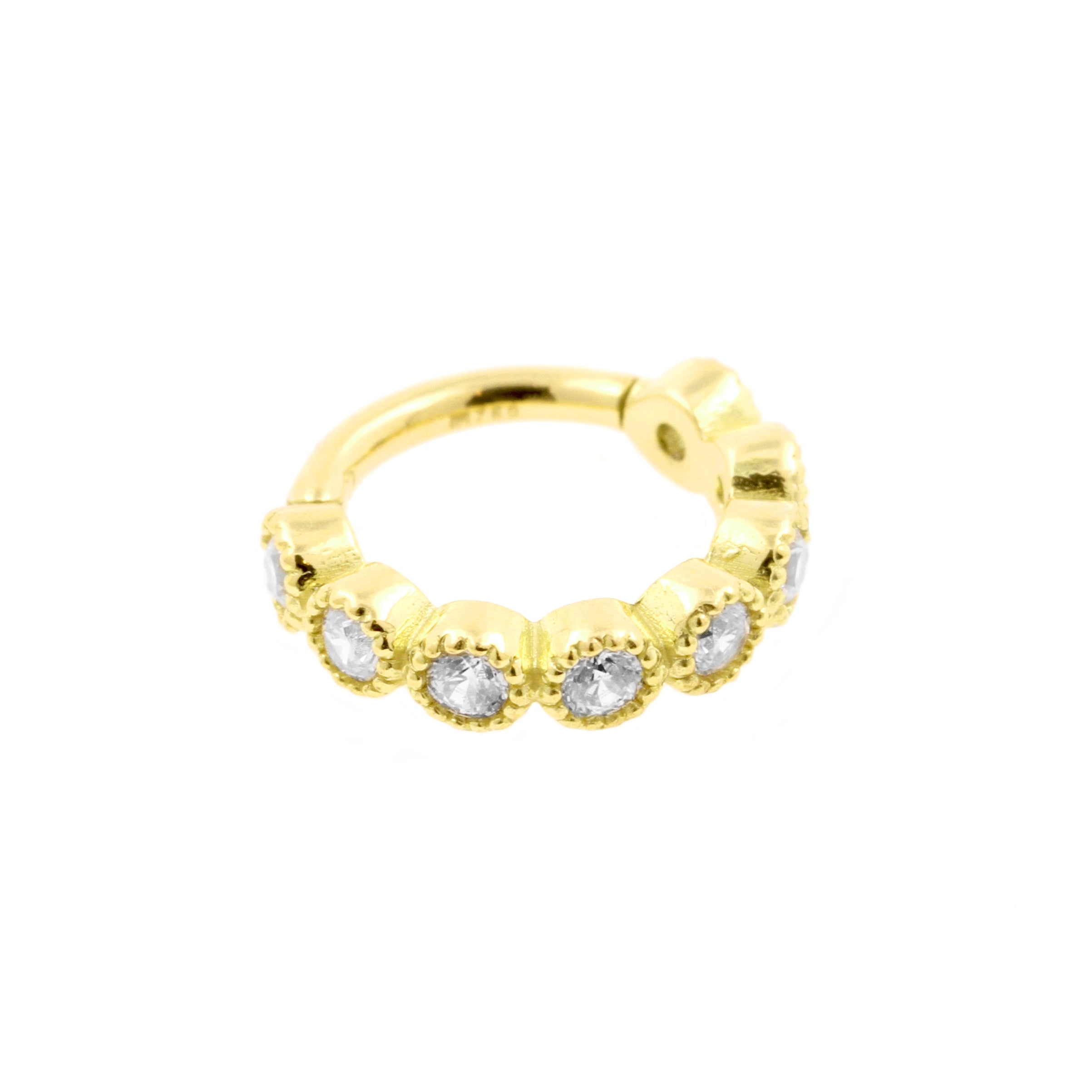 Klik, en het zit! Mooie Click Ring voor je piercings, gemaakt van 18 karaats goud met prachtige versiering aan de onderzijde. De piercing clicker is ingezet met premium zirkonia. Makkelijk in en uit te doen en supercomfortabel. Het segmentje in deze ring zit vast aan de ring en de ring heeft aan een zijde een scharnier. Je klikt hem zo open, doet hem in je piercing en klikt hem weer dicht. Done! De click ring is ideaal voor diverse piercings en staat fantastisch in oorpiercings!