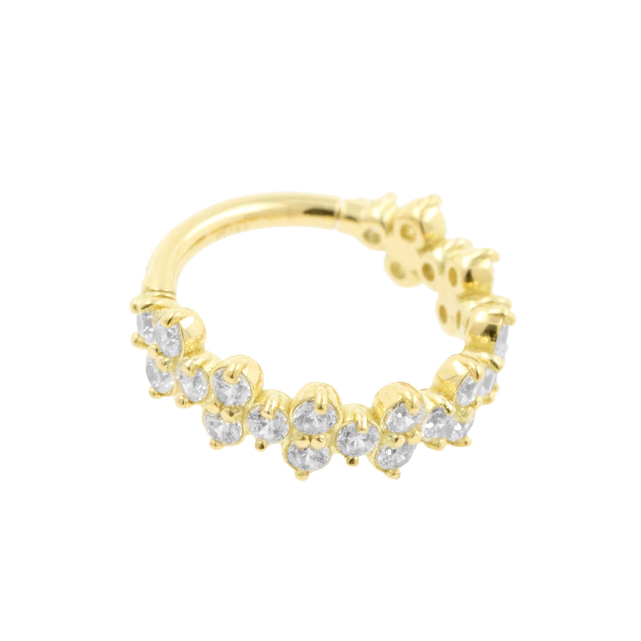 Klik, en het zit! Prachtige click ring speciaal voor je conch piercings, gemaakt van echt 18 karaats goud. De conch clicker is geschikt voor 1,2 mm piercings en is voorzien van een prachtige versiering, ingezet met premium zirkonia. Onze click ringen zijn makkelijk in en uit te doen en zitten supercomfortabel. Geen gedoe met wegspringende segmentjes: het segmentje is met een scharnier vast gezet aan een zijde van de ring. Je klikt hem zo open, doet hem in je piercing en klikt hem weer dicht. Done! Onze echt gouden conch clickers zijn geschikt voor diverse piercings, maar is vooral ideaal voor conch piercings.