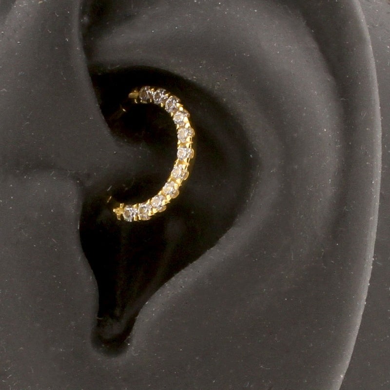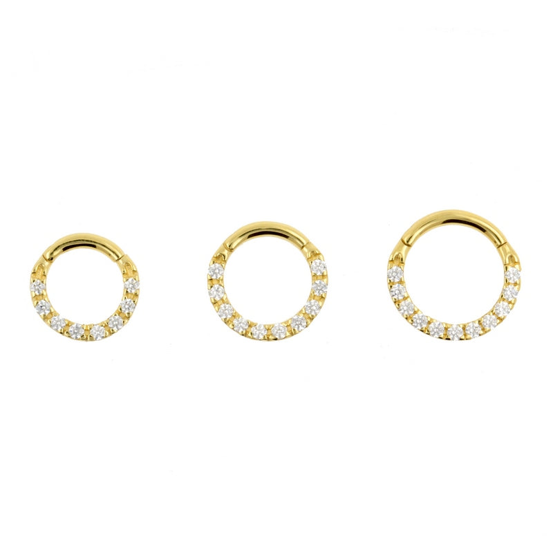 Superfancy piercing ring van 18 karaats goud met eenvoudig clicksysteem om hem te openen en te sluiten! Deze prachtige ring is aan de voorzijde voorzien van schitterende zirkonia's in een zetting en heeft een rondgebogen staafje. Deze ringen zijn perfect voor septumpiercings, traguspiercings en allerlei andere piercings en geeft ze een superchique uitstraling. Gemaakt van hoge kwaliteit 18 karaats goud, superglad gepolijst tot een spiegelend oppervlak.