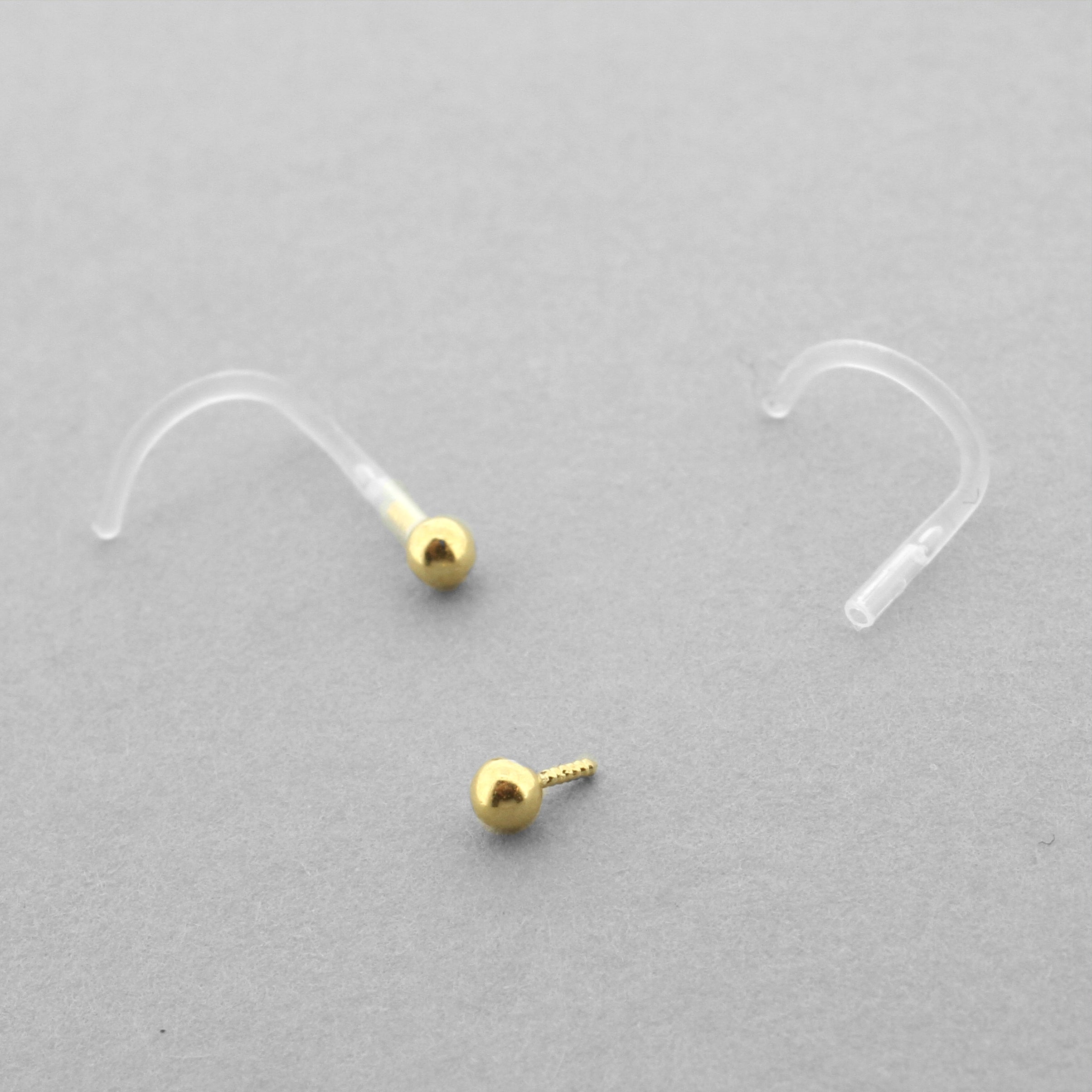 Supercomfortabel en stylish! Fijne nosestud gemaakt van Bioplast met een dikte van 0,8 mm. Aan de bovenzijde is deze nosestud voorzien van een 18 karaats gouden insert. Het staafje van de nosestud is rond gebogen zodat het sieraad goed op zijn plek blijft zitten. Stijlvol en comfortabel sieraad voor je neuspiercing!