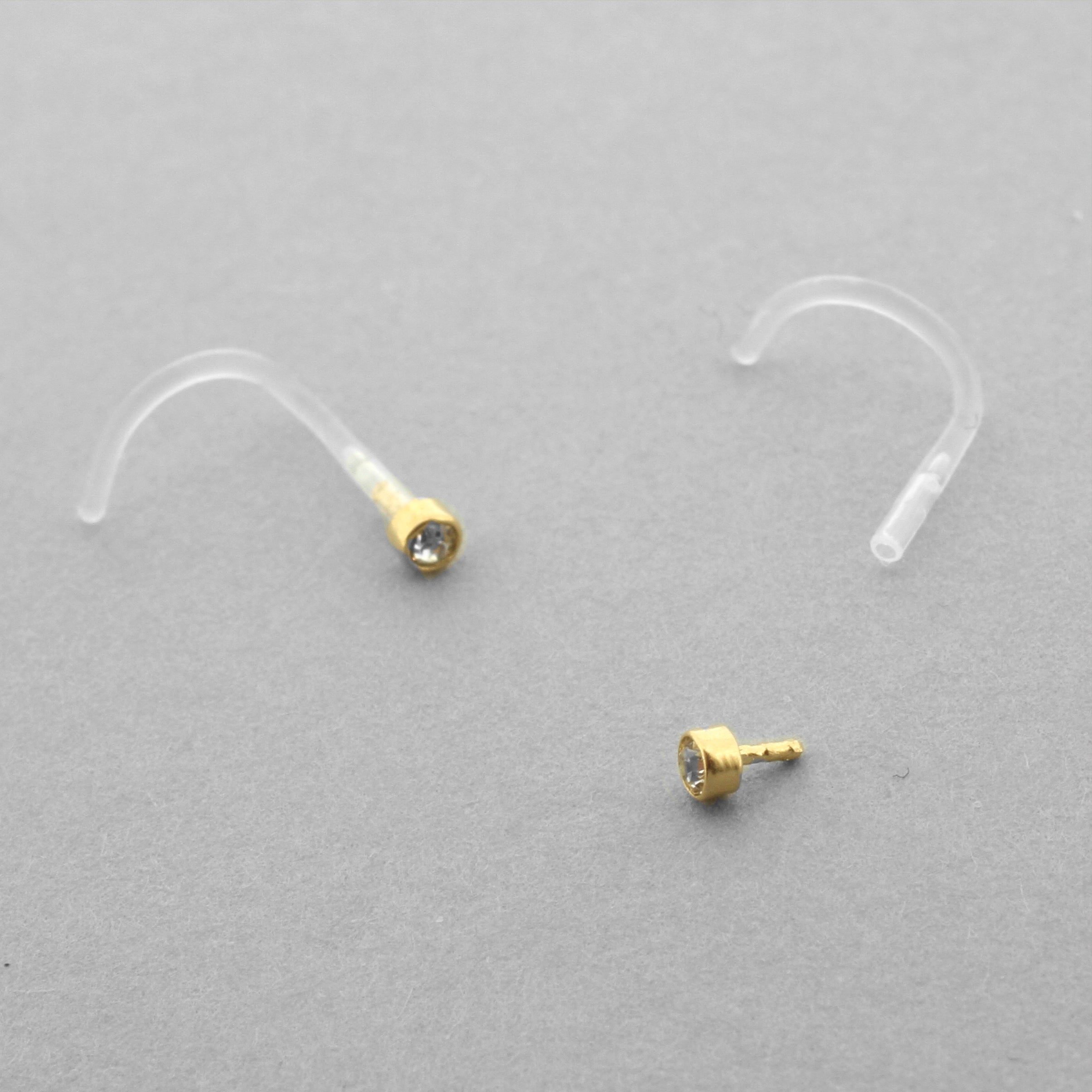 Supercomfortabel en stylish! Fijne nosestud gemaakt van Bioplast met een dikte van 0,8 mm. Aan de bovenzijde is deze nosestud voorzien van een 18 karaats gouden insert met zirkonia. Het staafje van de nosestud is rond gebogen zodat het sieraad goed op zijn plek blijft zitten. Stijlvol en comfortabel sieraad voor je neuspiercing!