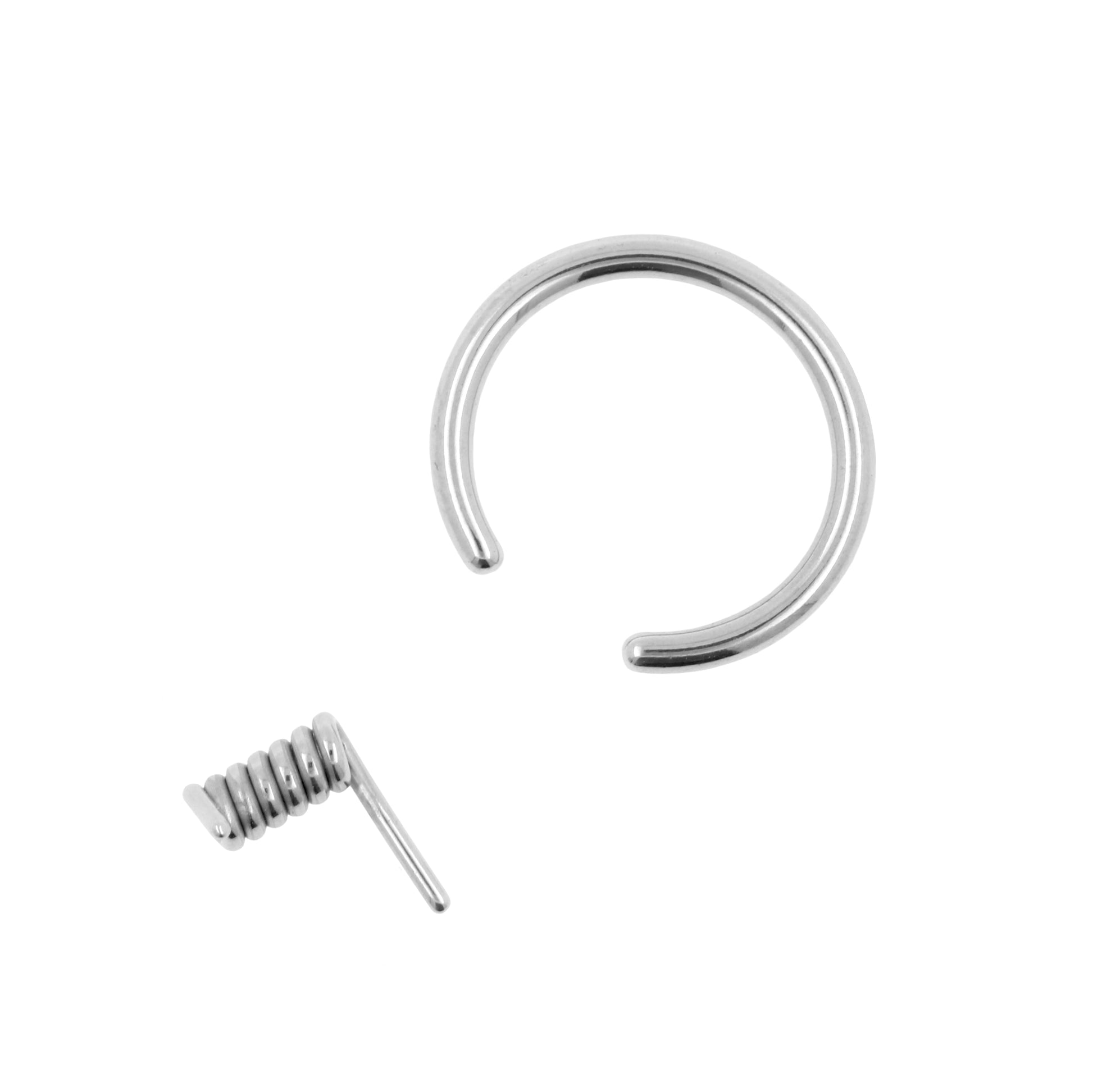 Barb Wire ring van chirurgisch staal met gedraaid draadmotief en sluiting die over de uiteinden glijdt. Stevig, duurzaam en met de hand te openen.
