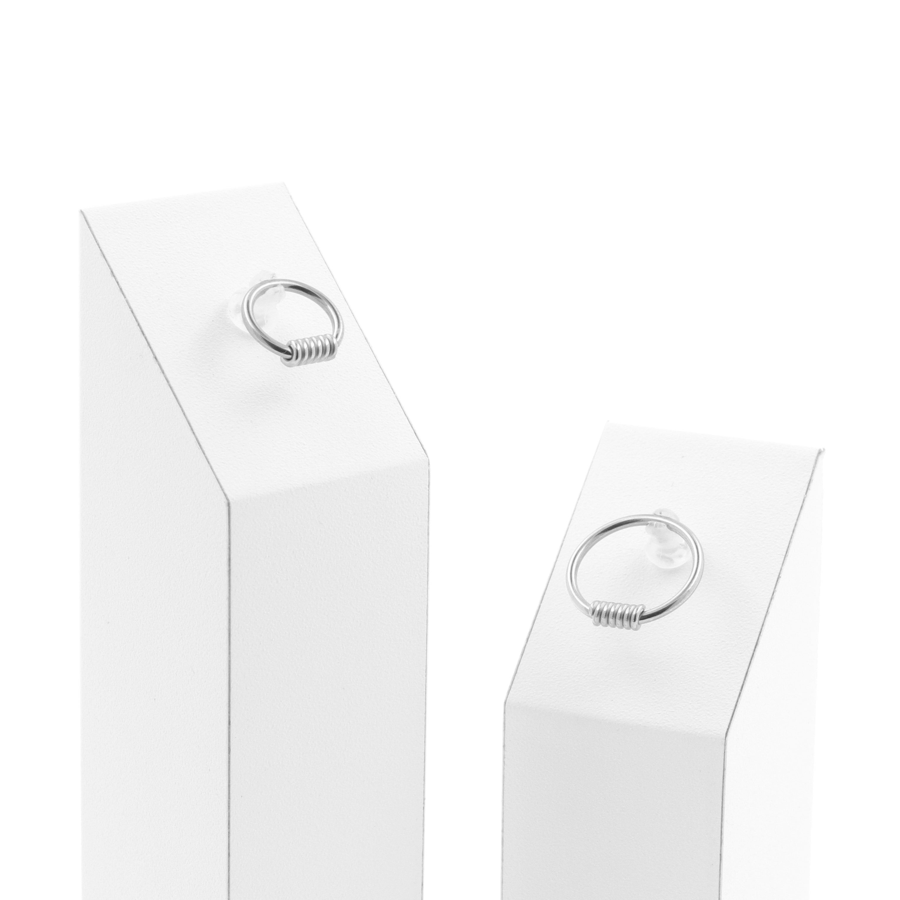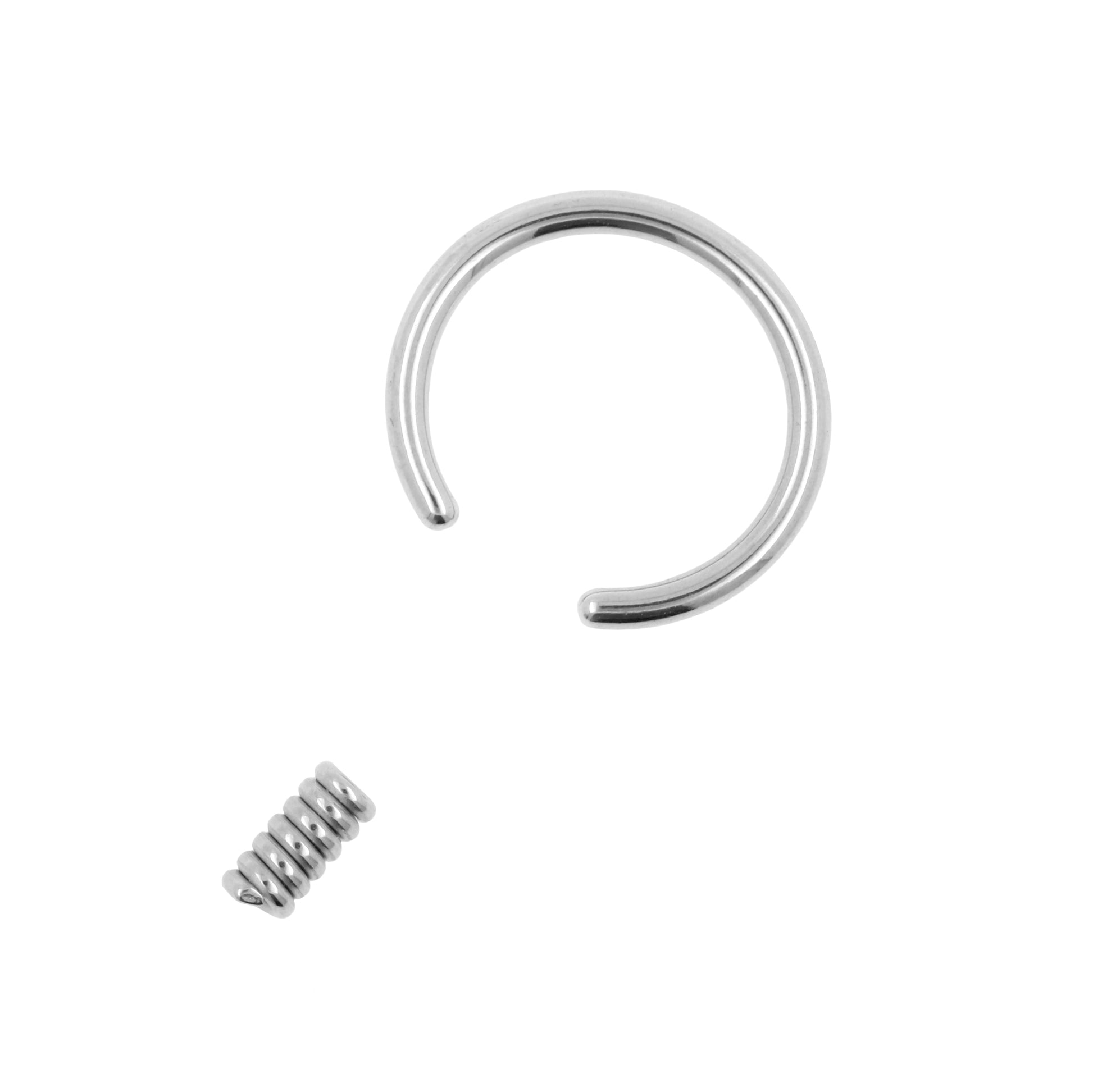 Scroll ring van chirurgisch staal met rolvormige sluiting die over de uiteinden glijdt. Eenvoudig met de hand te openen, stevig en comfortabel.