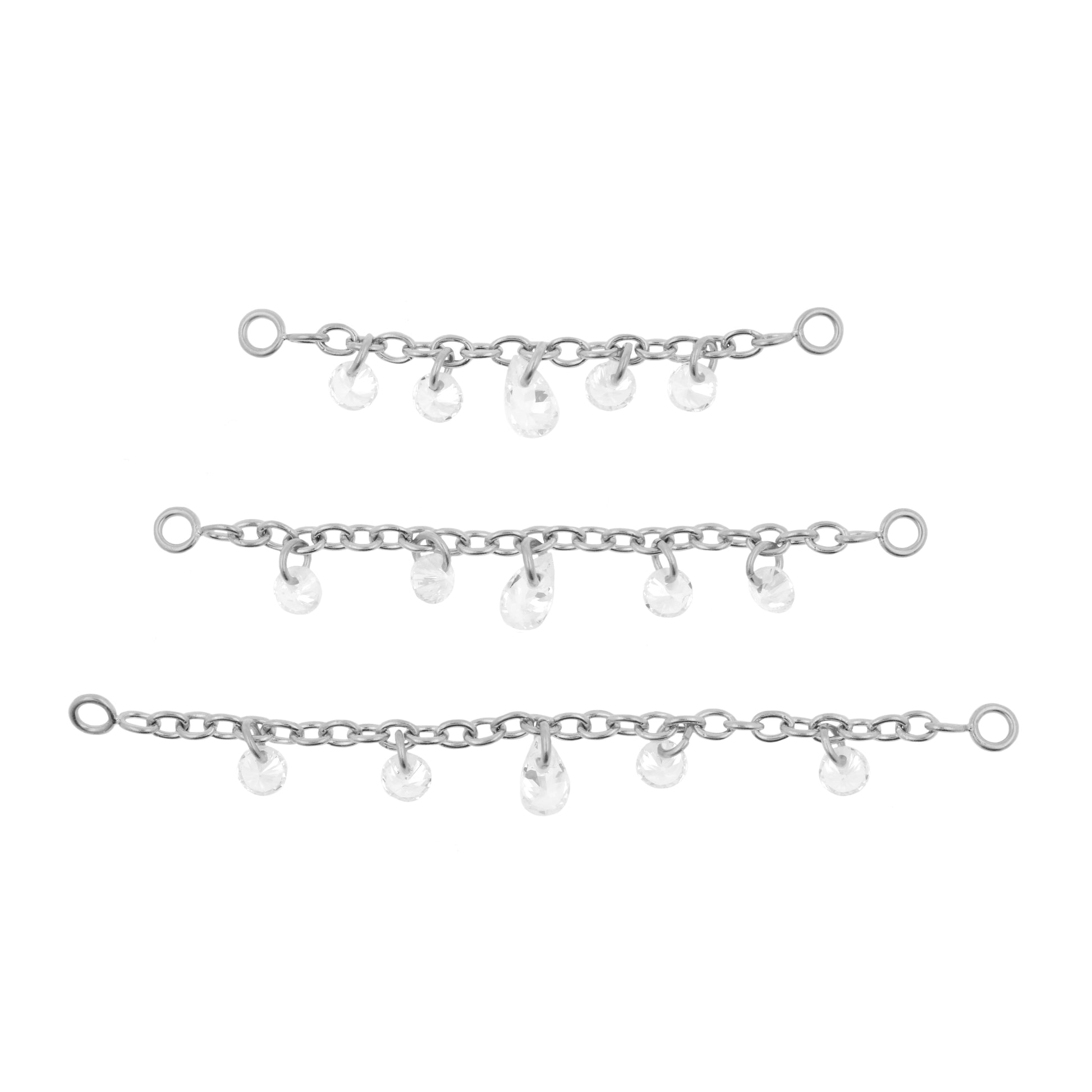 Zilverkleurig chirurgisch staal piercing kettinkje, voorzien van Versierd met clear zirkonia steentjes. Aan de uiteindes zitten bevestigingsringetjes van 1,6 mm binnendiameter, geschikt voor piercings tot 1,2 mm dikte. Leverbaar in 30, 40, 50 mm lengte.- Chirurgisch Staal- Versierd met clear zirkonia steentjes- Bevestigingsringetjes: binnendiameter 1,6 mm- Geschikt voor piercings tot 1,2 mm dikte- Lengtes: 30, 40, 50 mmEen stijlvol accessoire voor creatieve piercingcombinaties.