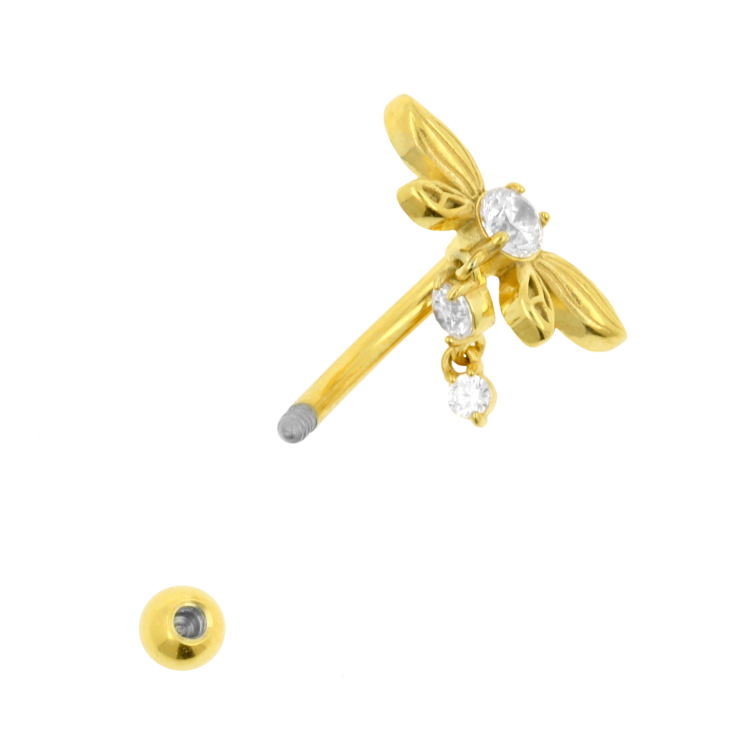 Navelpiercing van chirurgisch staal met gouden P.V.D.-coating en cubic zirkonia's. Voorzien van normaal schroefdraad.- Materiaal: Chirurgisch staal- Coating: gouden P.V.D.-coating- Steen: cubic zirkonia- Schroefdraad: normaalStijlvolle piercing, ideaal voor iedere collectie.