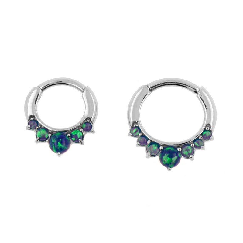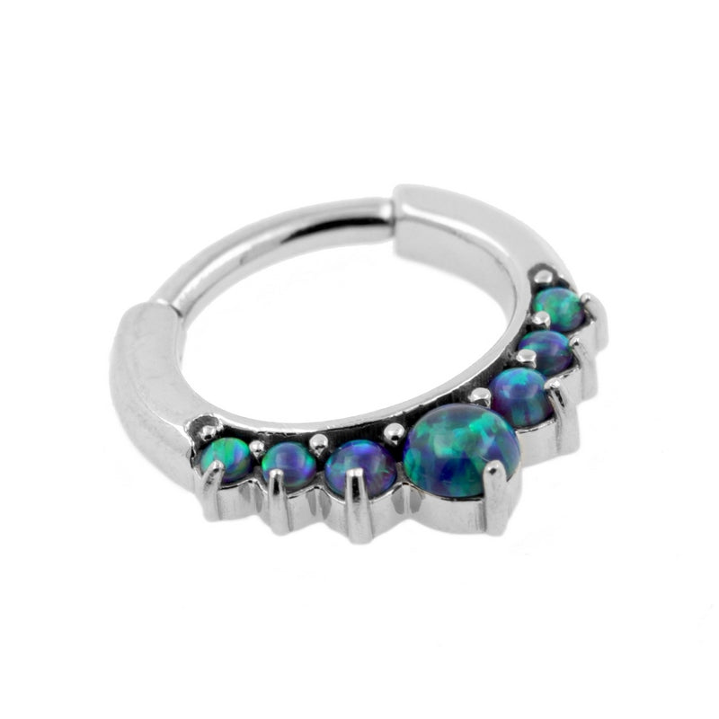 Superfancy septumring met eenvoudig clicksysteem om hem te openen en te sluiten. Deze prachtige ring is voorzien van cabochon geslepen syntetische opalen in een zetting en heeft een rondgebogen staafje. Deze ringen zijn zeer compact en sluiten daarom goed aan op je septum wat ze een extra chique uitstraling geeft. Gemaakt van hoge kwaliteit chirurgisch staal, gepolijst tot een spiegelend oppervlak.