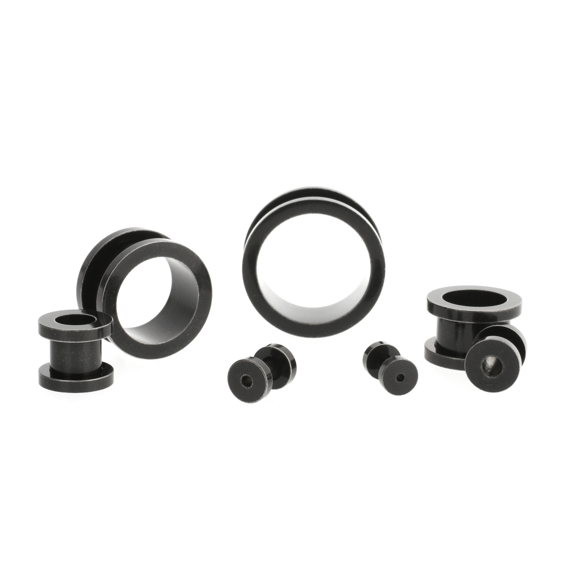 Tunnel van chirurgisch staal met zwarte Titanium IP coating. Afgewerkt met een vintage uitstraling en voorzien van een afschroefbare flare.