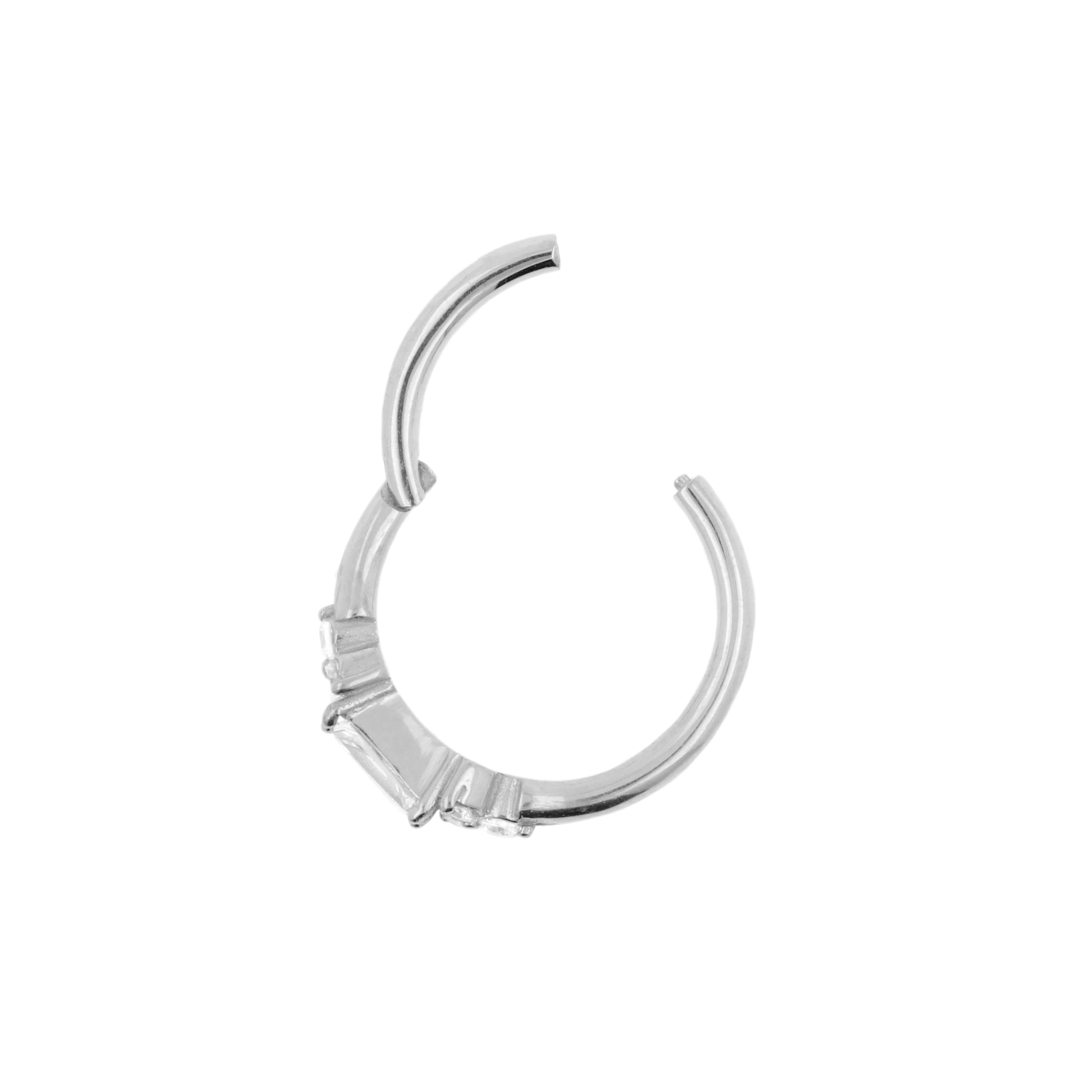 Click ring van zilverkleurig nikkelvrij staal (glans van witgoud), ingezet met transparante zirkonia. Voorzien van handig klikmechanisme.