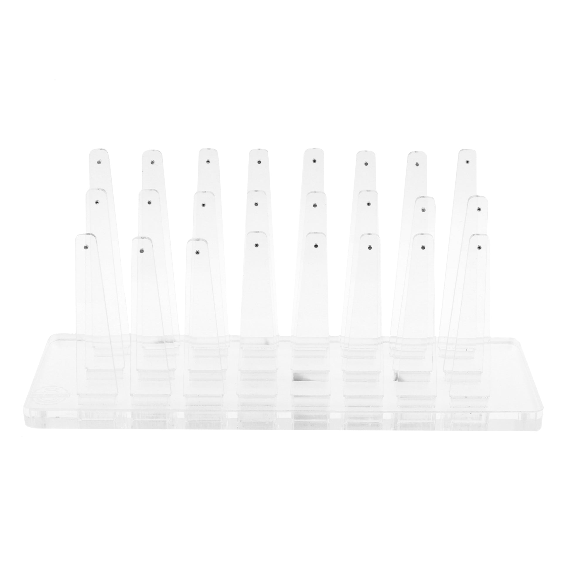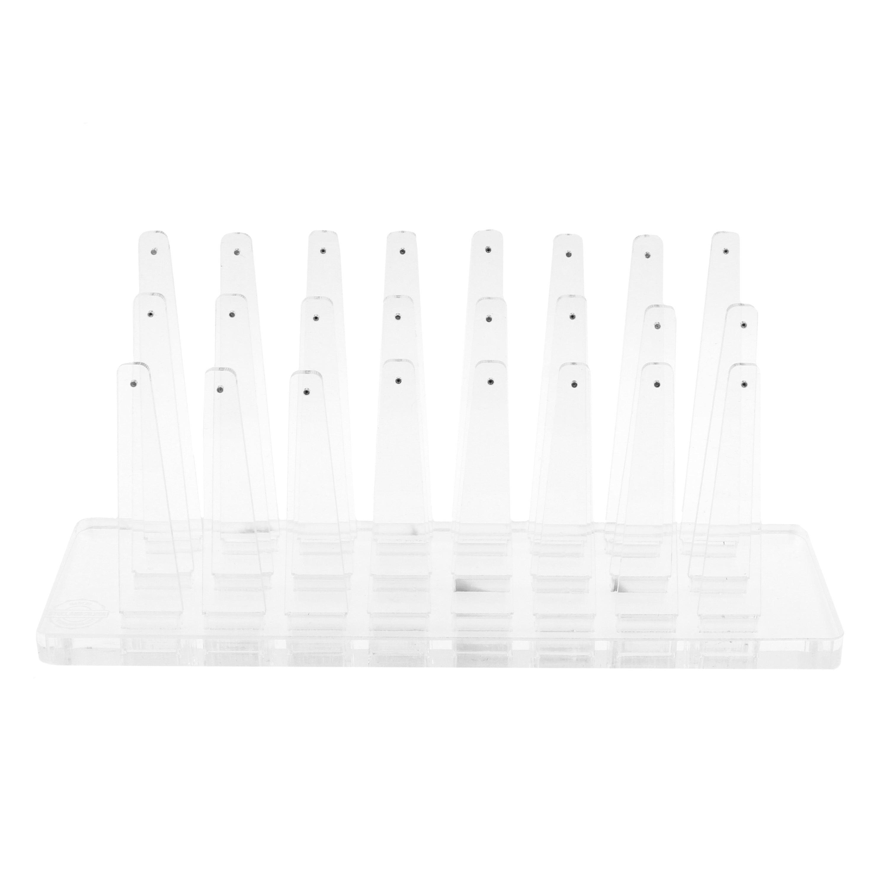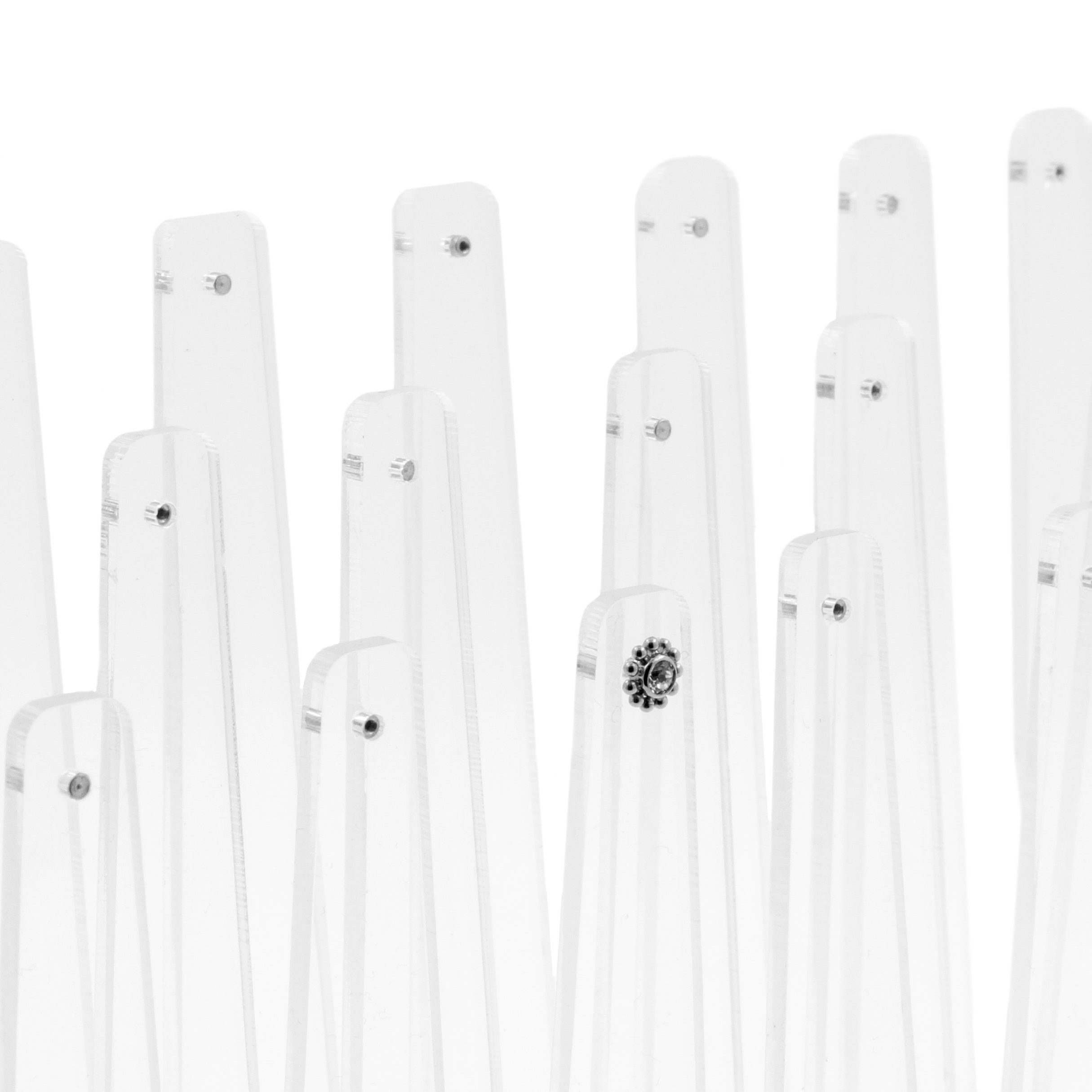 Handige display van acryl, voor accessoires met inwendig schroefdraad. Perfect om piercing accessoire collecties aan je klanten te laten zien. De display is voorzien van 24 uitneembare houders, zodat je het accessoire makkelijk voor het te piercen lichaamsdeel kunt houden. Je klant kan zo meteen zien hoe de (toekomstige) piercing eruit komt te zien. Ook handig om van tevoren te kijken of een piercing accessoire past, zonder dat je meteen het hele sieraad hoeft te verwisselen. Handig en hygiënisch! De display is voorzien van stalen staafjes voorzien van inwendig schroefdraad. Verkrijgbaar met 1,2 mm en 1,6 mm staafjes, in transparant acryl. De ideale aanvulling voor de toonbank in je piercing shop! Afmetingen display: 21 x 9 cm.