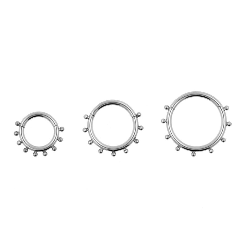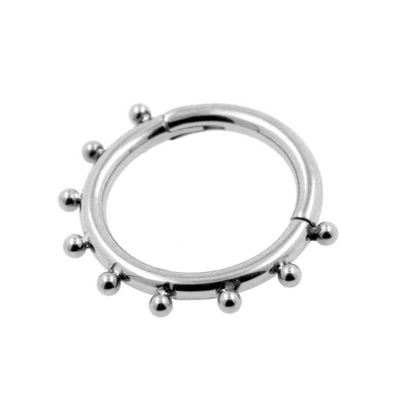 Makkelijk te openen en te sluiten! Mooie Click Ring voor je piercings, gemaakt van titanium en voorzien van kleine bolletjes ter versiering. De ideale ring voor je piercing als je graag een gladde ring in je piercings draagt die ook nog eens makkelijk te openen en sluiten is. Het segmentje in deze ring zit vast aan de ring en heeft aan een zijde een scharnier. Je klikt hem zo open, doet hem in je piercing en klikt hem weer dicht. Done! Met name geschikt voor traguspiercingss , helixpiercings en septumpiercings.