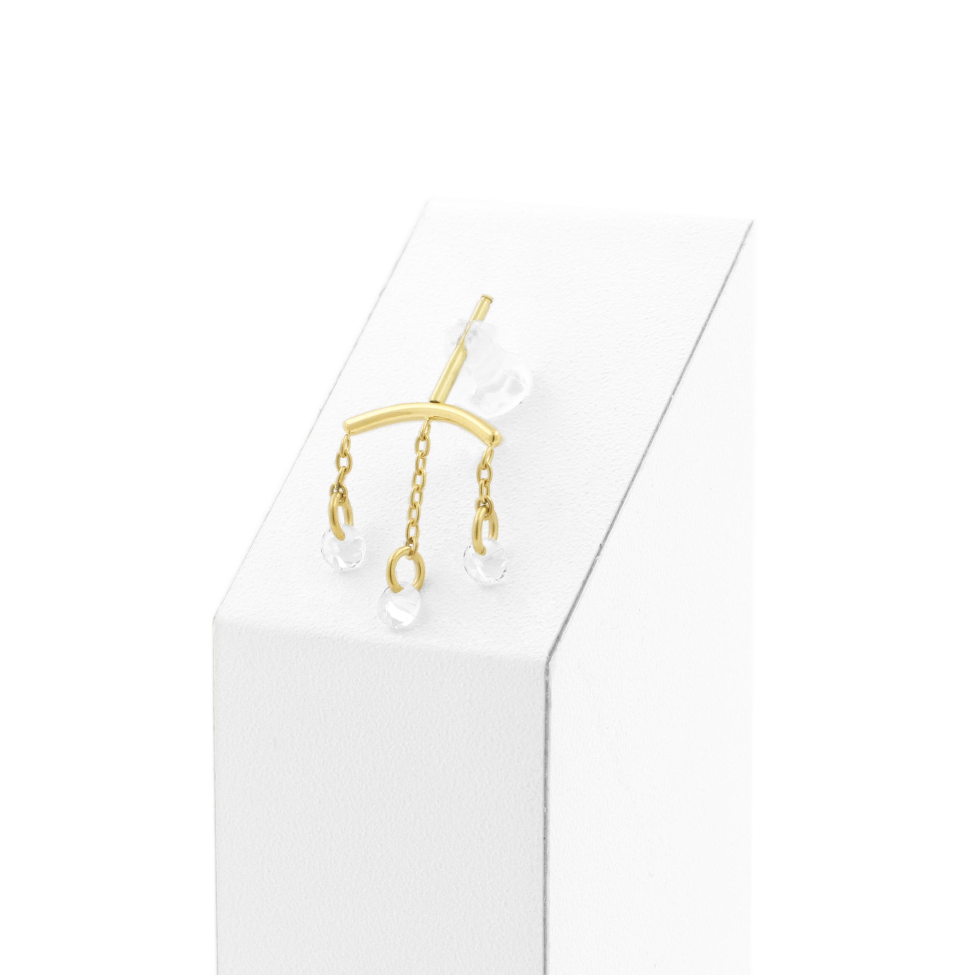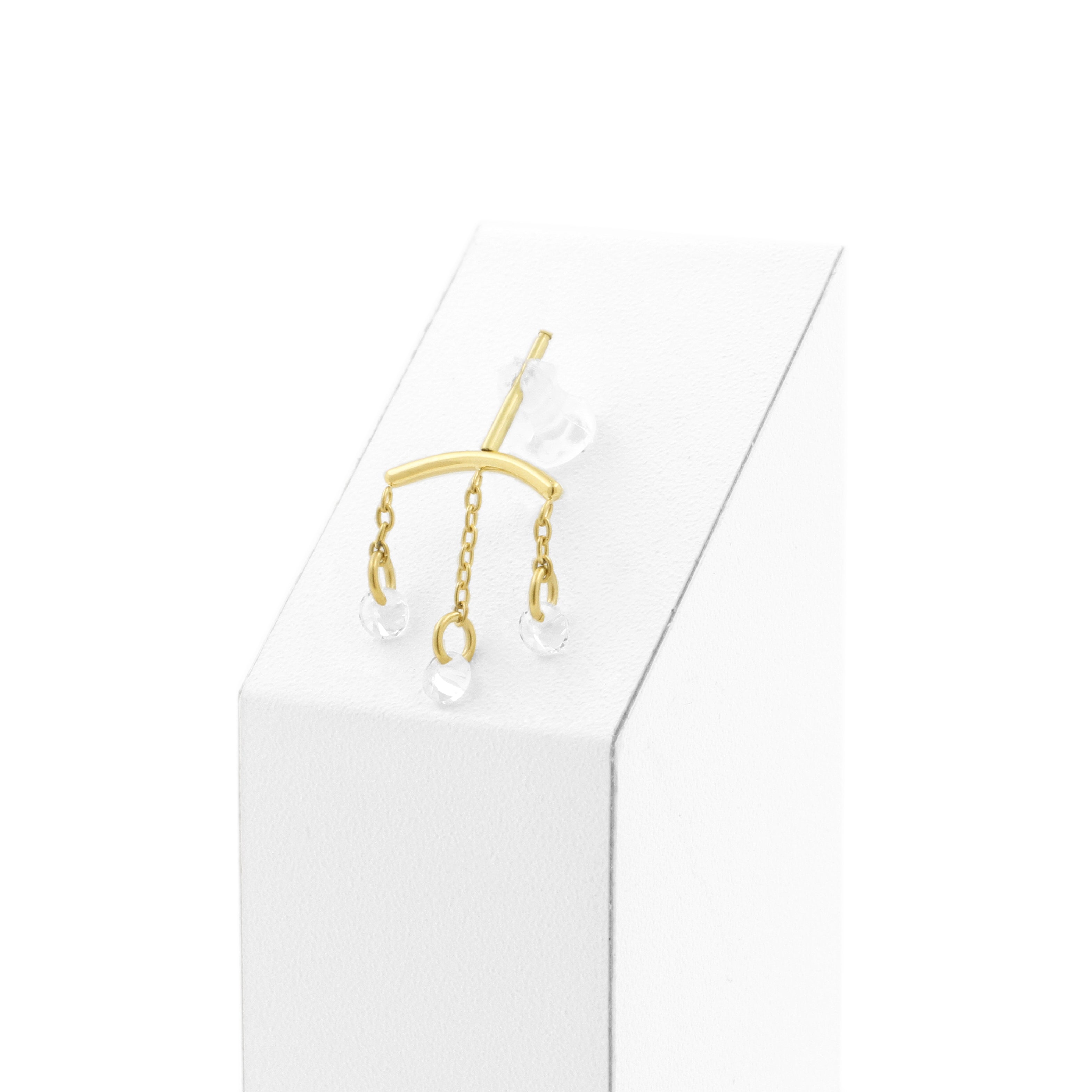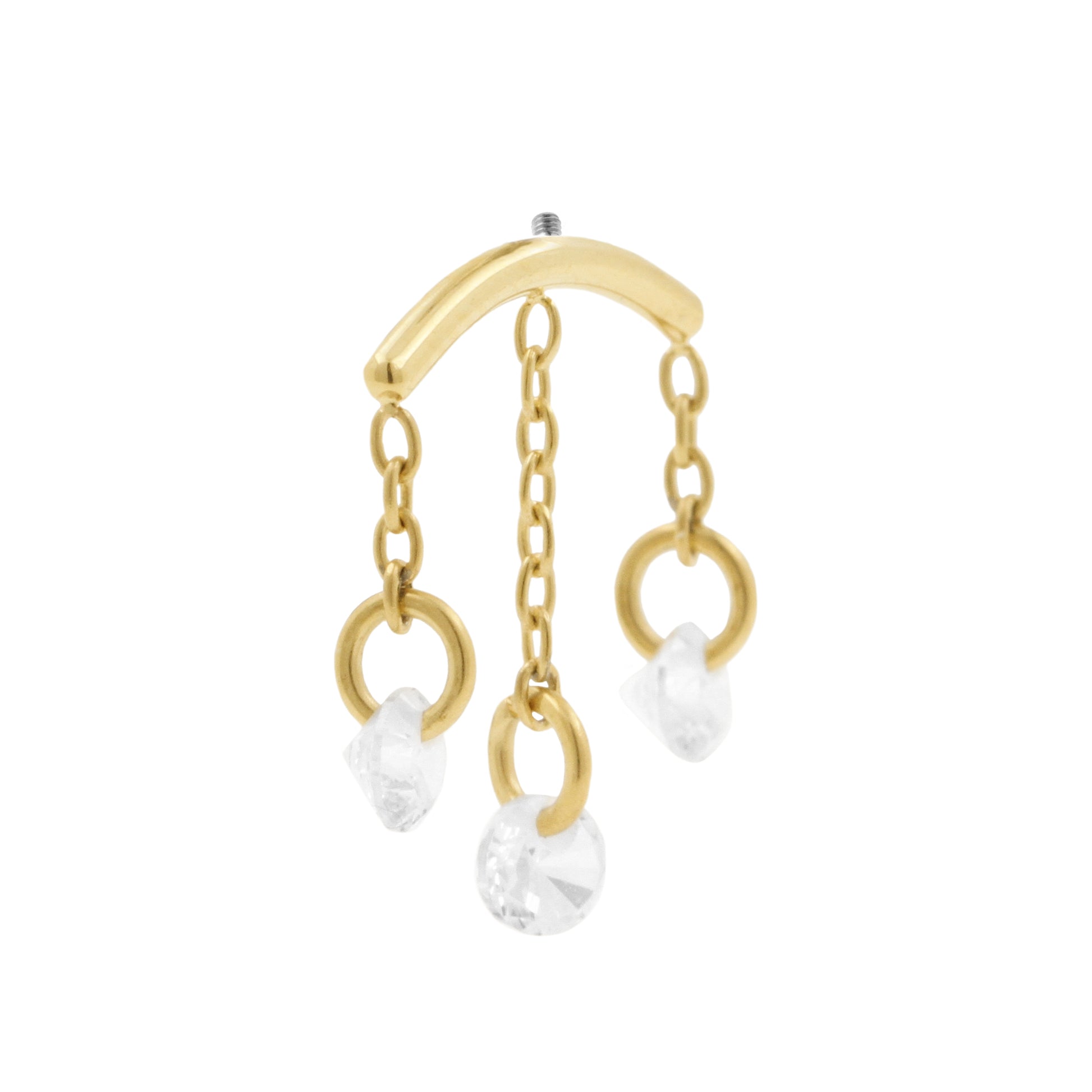 Titanium vertical helix curve met 18 karaats PVD gold coating die qua kleur matcht met ons echt gouden assortiment, voorzien van bungelende clear cubic zirconia. Internally Threaded, geschikt voor 1,2 mm staafjes. Per stuk geleverd, alleen de top (staafjes los verkrijgbaar).