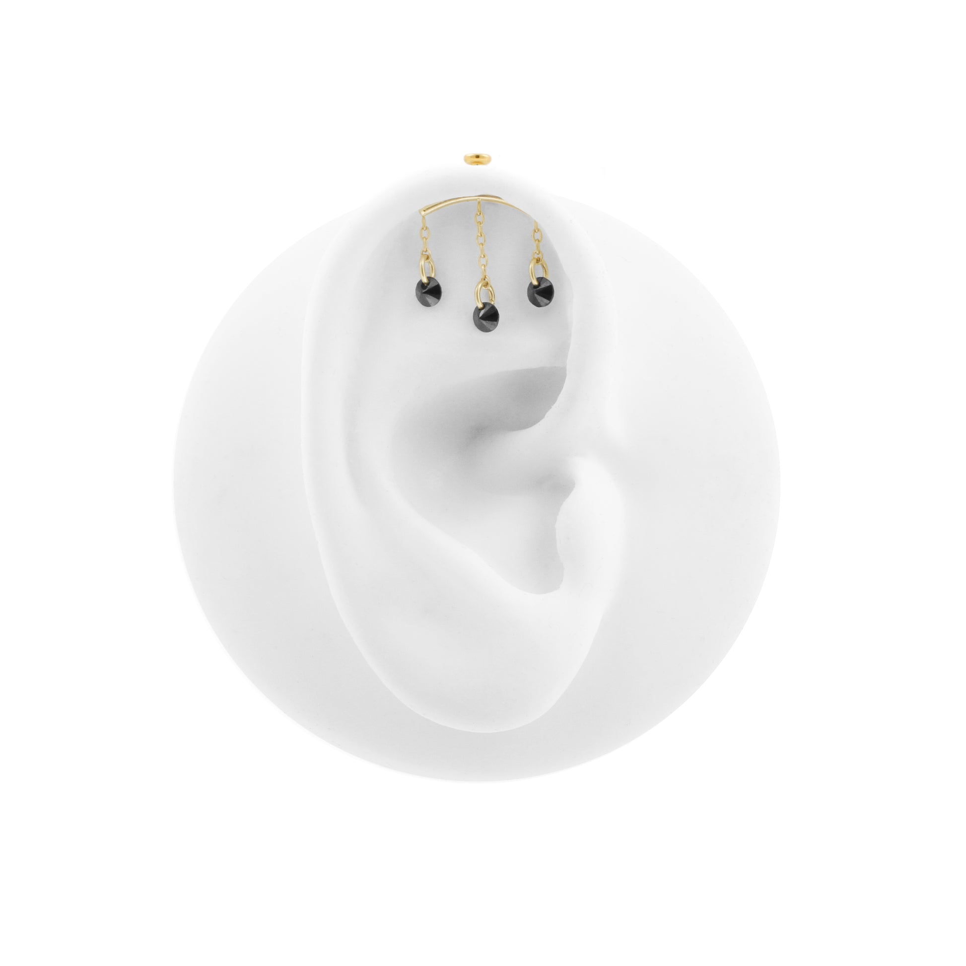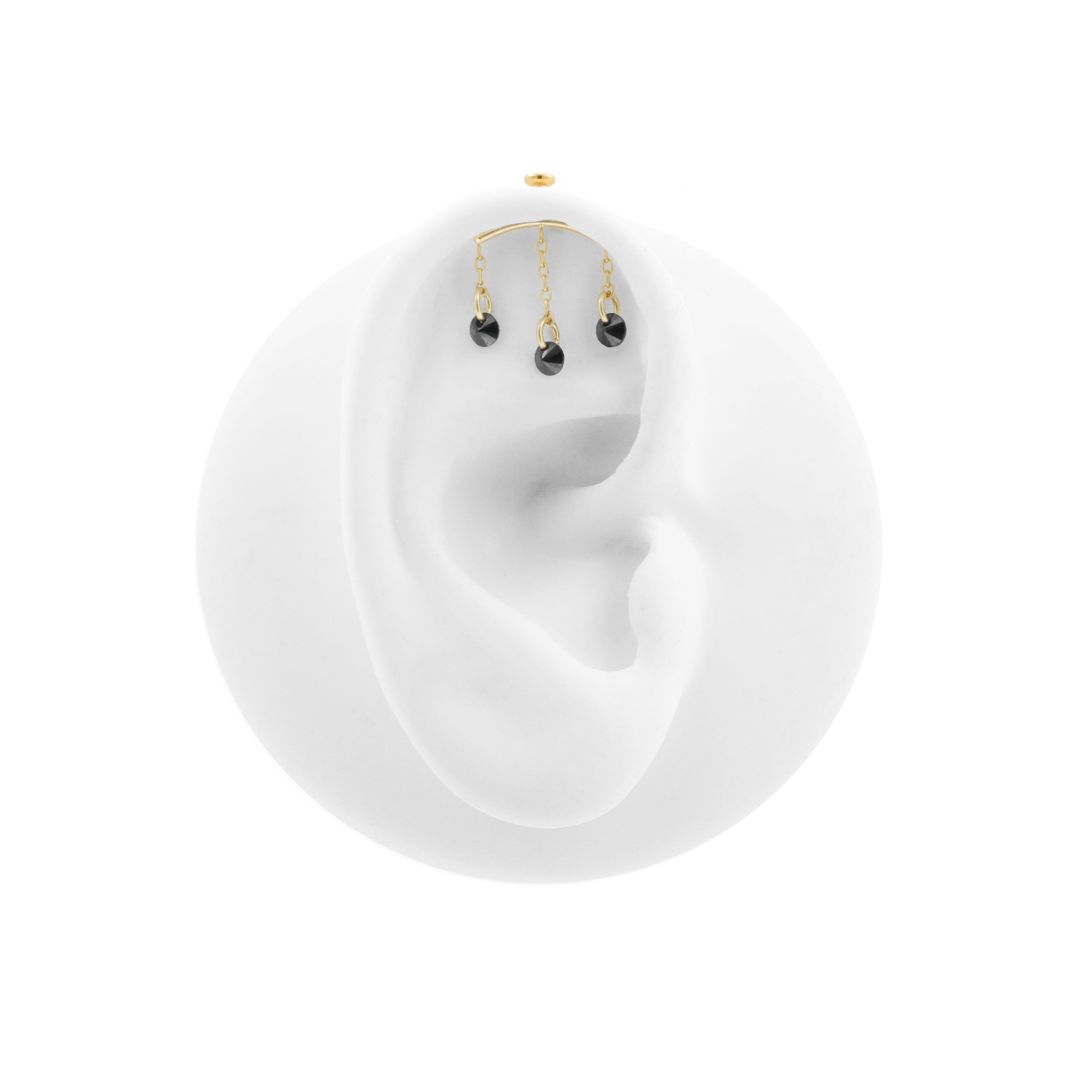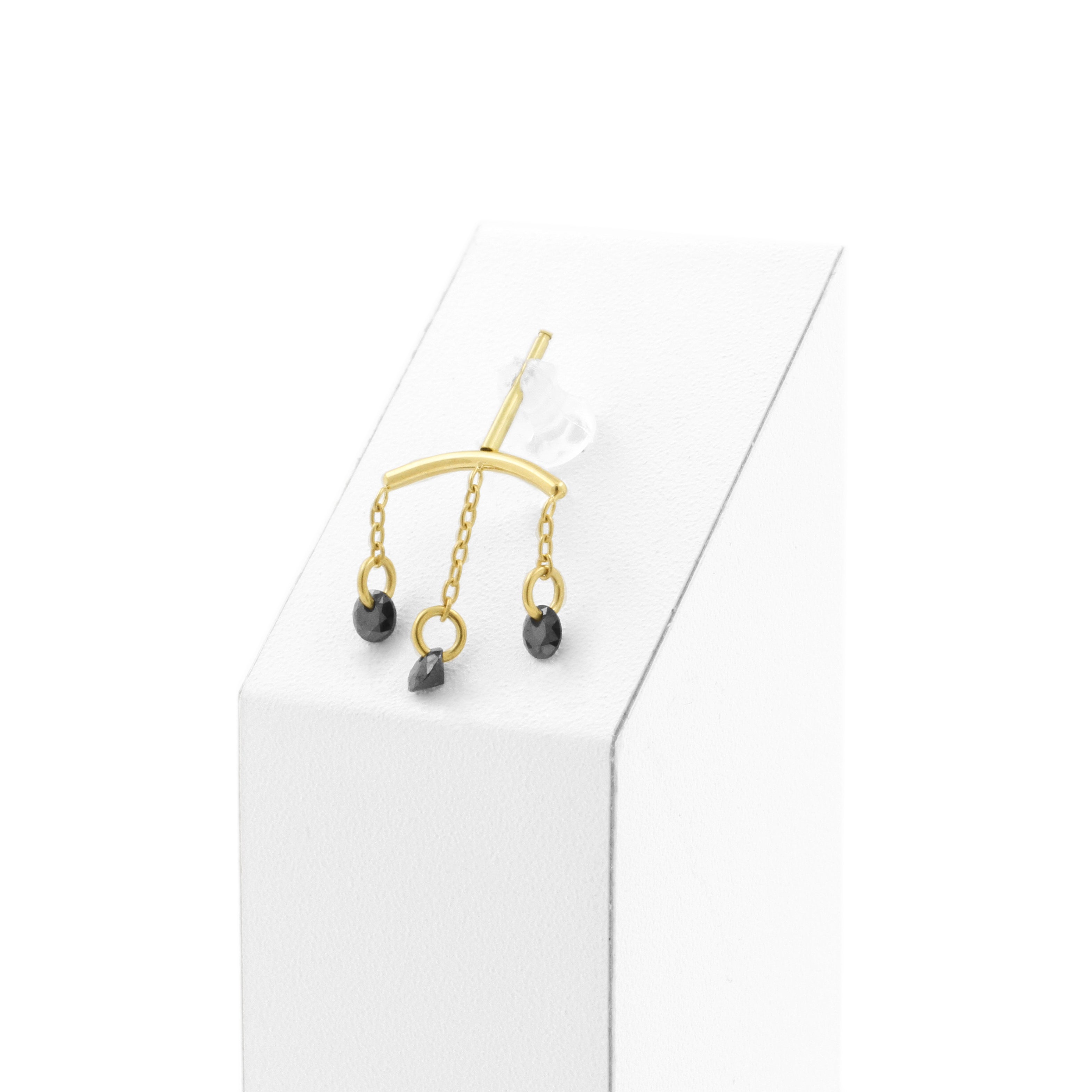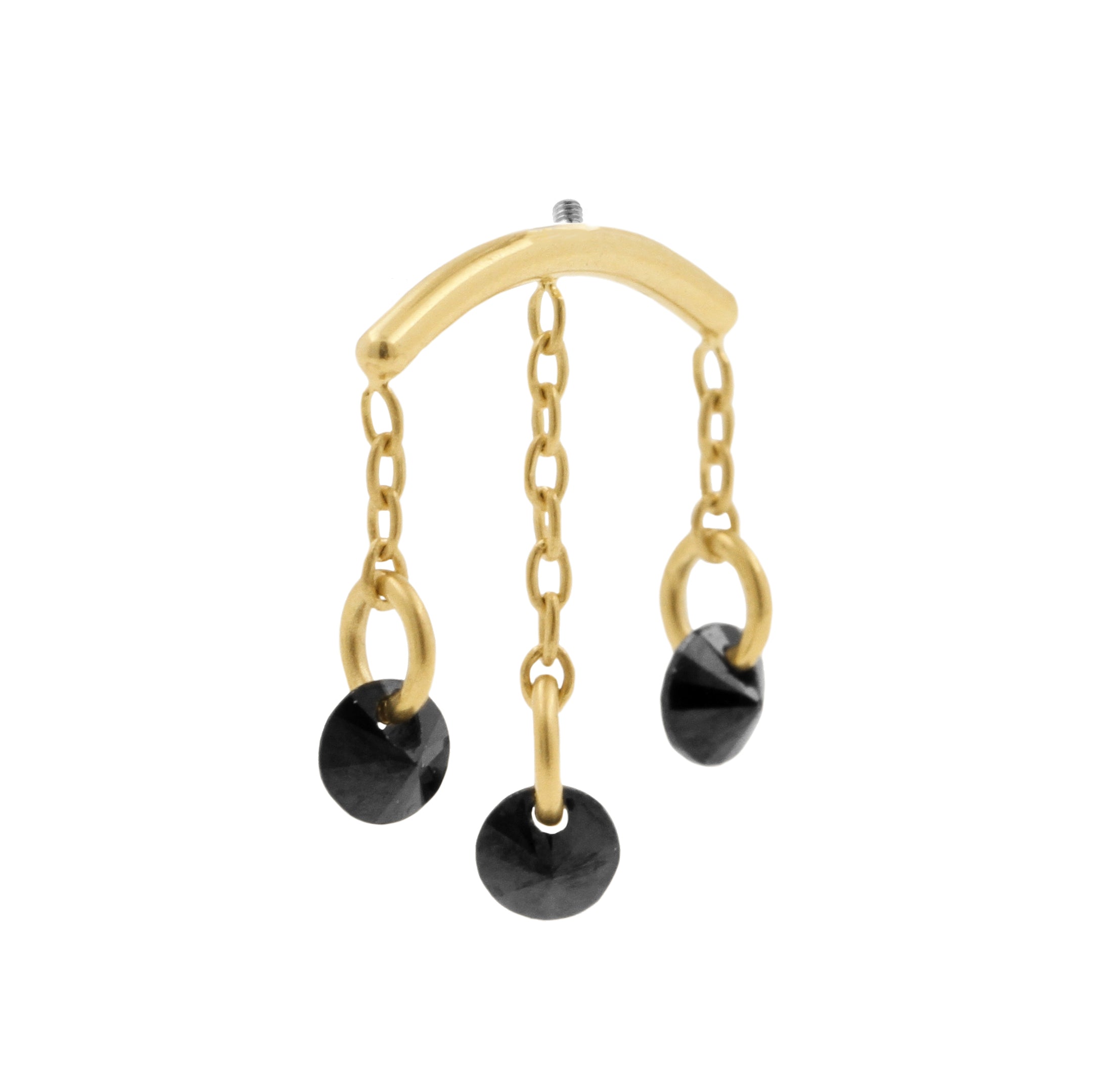 Titanium vertical helix curve met 18 karaats PVD gold coating die qua kleur matcht met ons echt gouden assortiment, voorzien van bungelende black cubic zirconia. Internally Threaded, geschikt voor 1,2 mm staafjes. Per stuk geleverd, alleen de top (staafjes los verkrijgbaar).