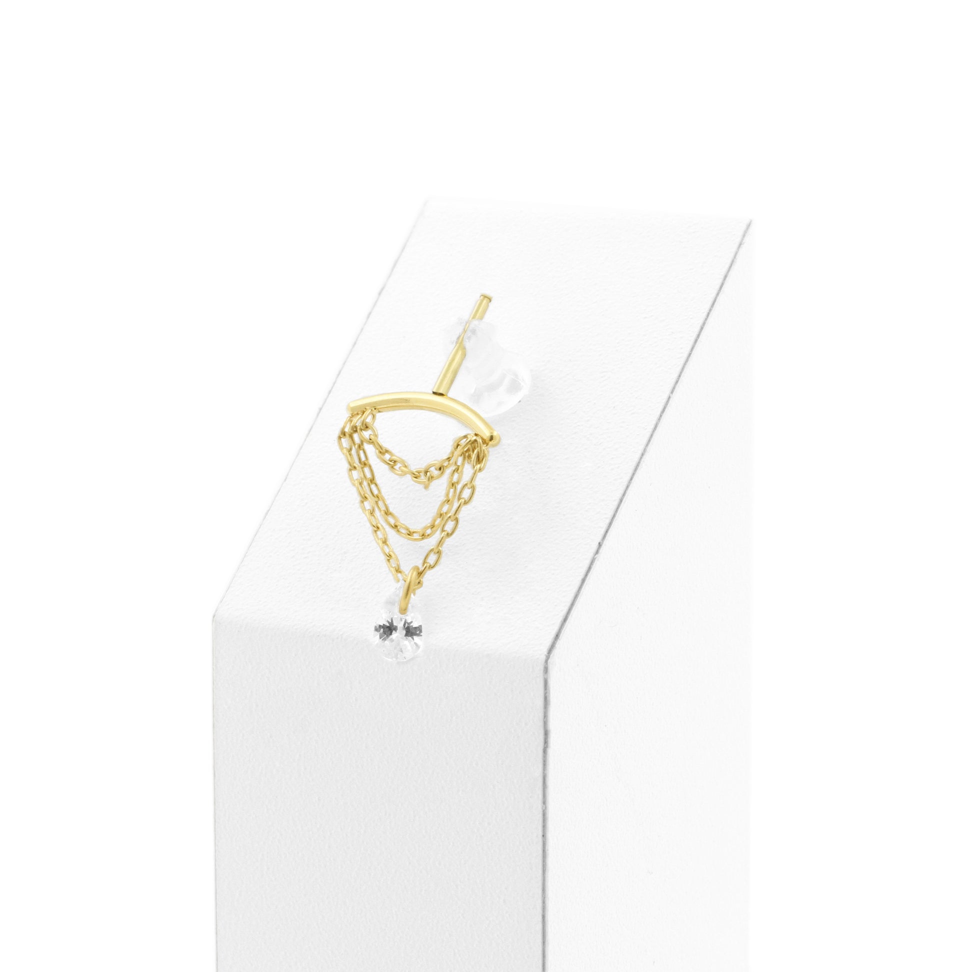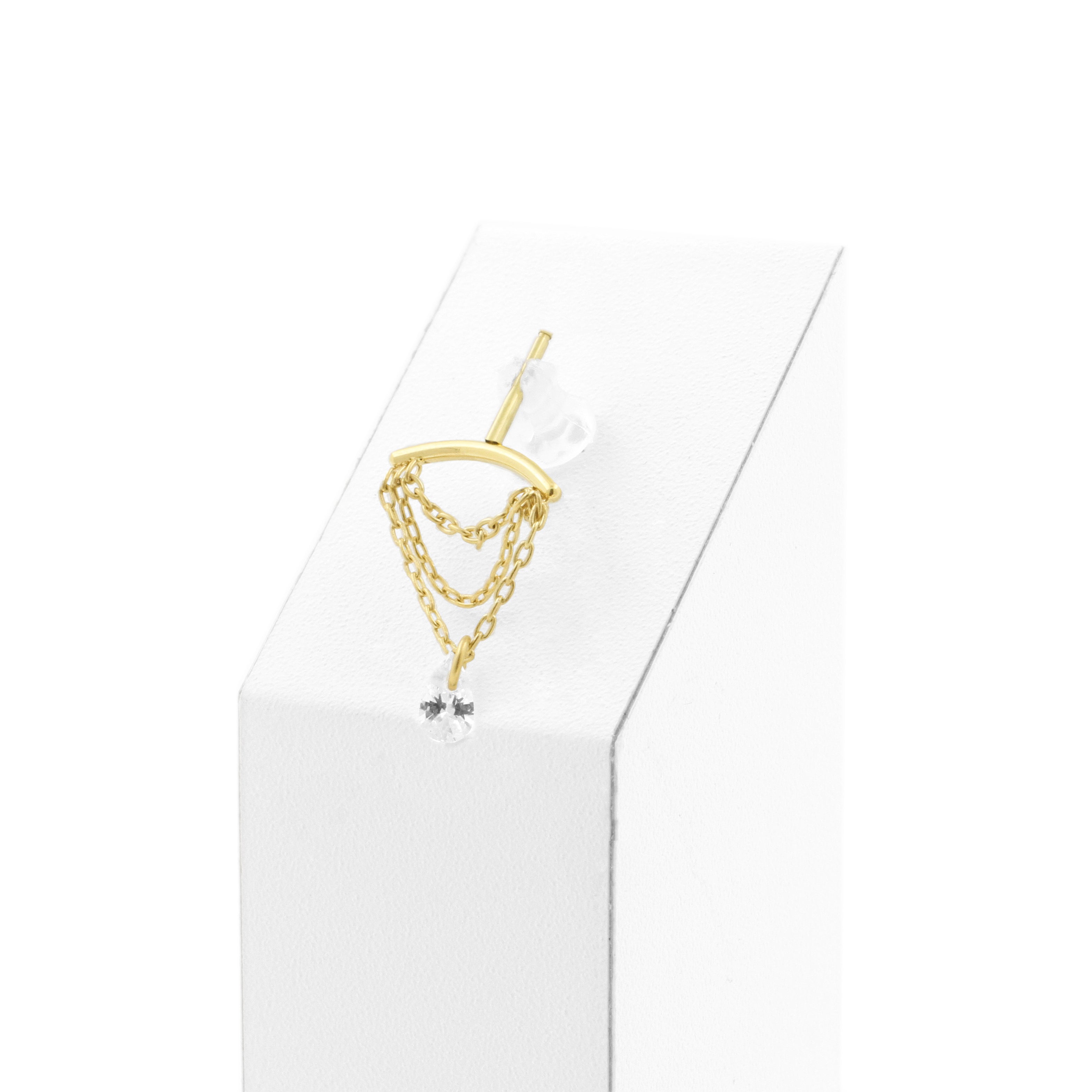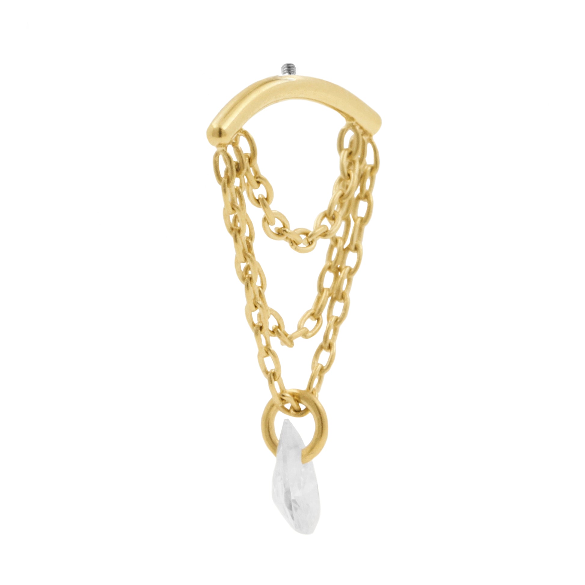 Titanium vertical helix curve met 18 karaats PVD gold coating die qua kleur matcht met ons echt gouden assortiment, voorzien van bungelende clear cubic zirconia. Internally Threaded, geschikt voor 1,2 mm staafjes. Per stuk geleverd, alleen de top (staafjes los verkrijgbaar).