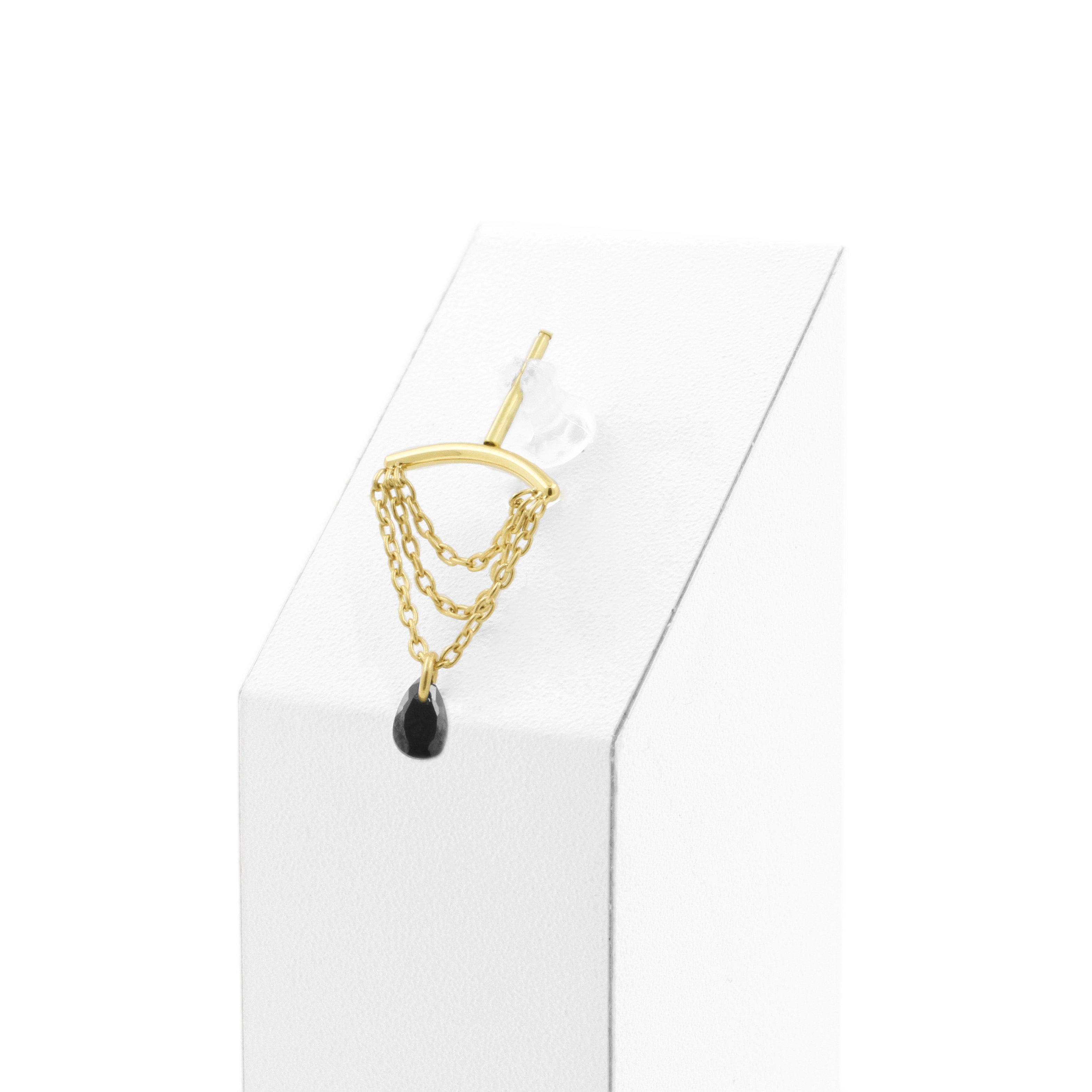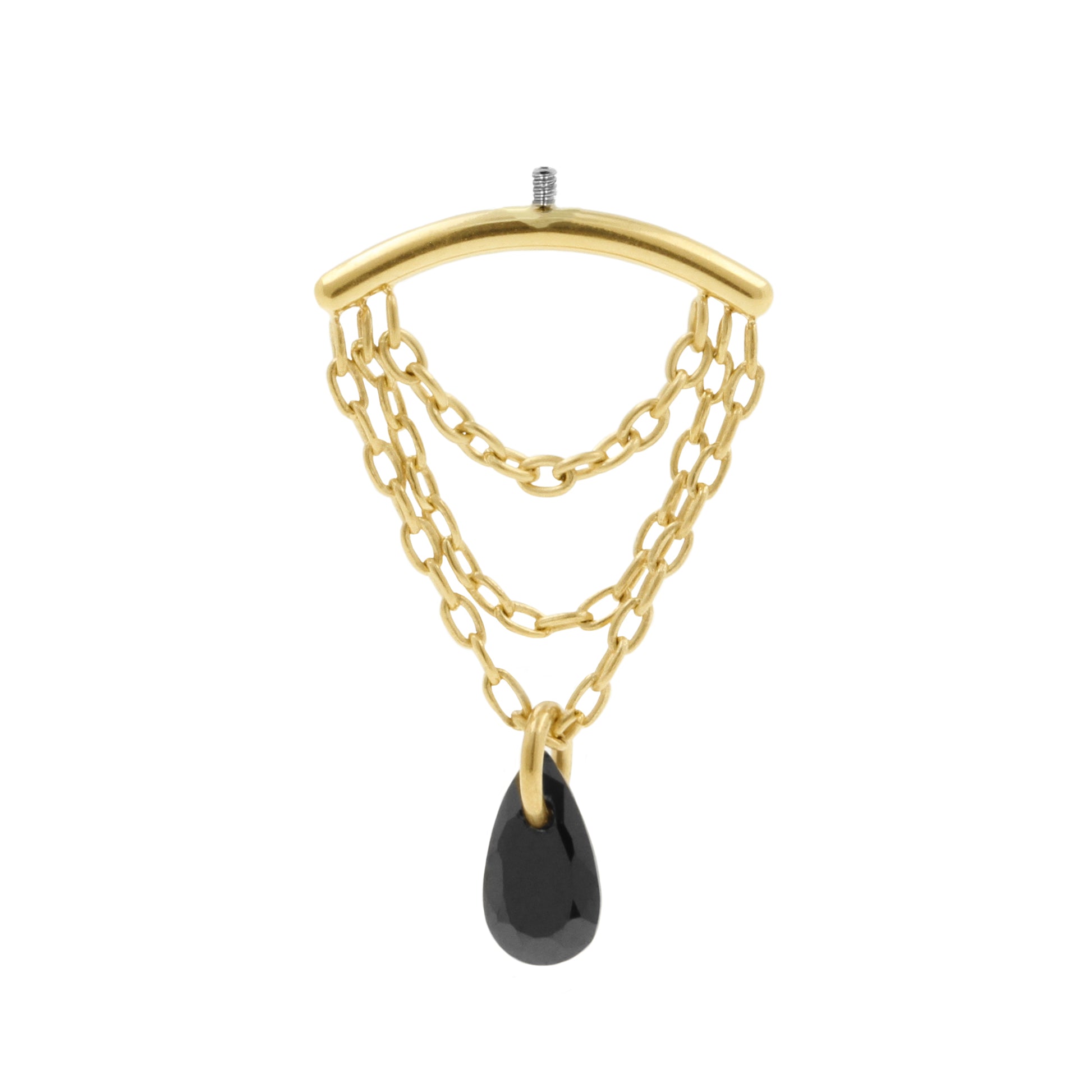 Titanium vertical helix curve met 18 karaats PVD gold coating die qua kleur matcht met ons echt gouden assortiment, voorzien van bungelende black cubic zirconia. Internally Threaded, geschikt voor 1,2 mm staafjes. Per stuk geleverd, alleen de top (staafjes los verkrijgbaar).