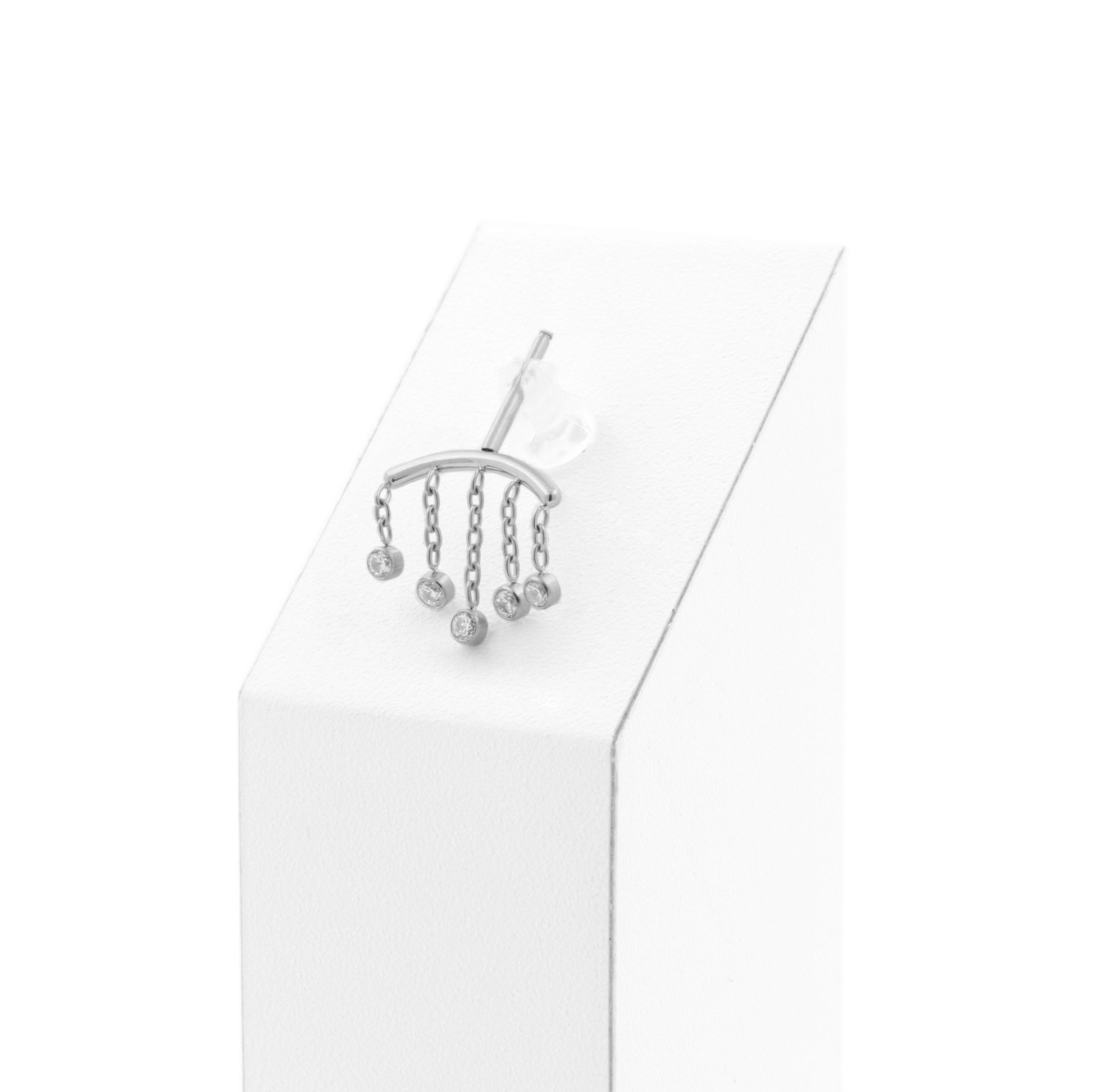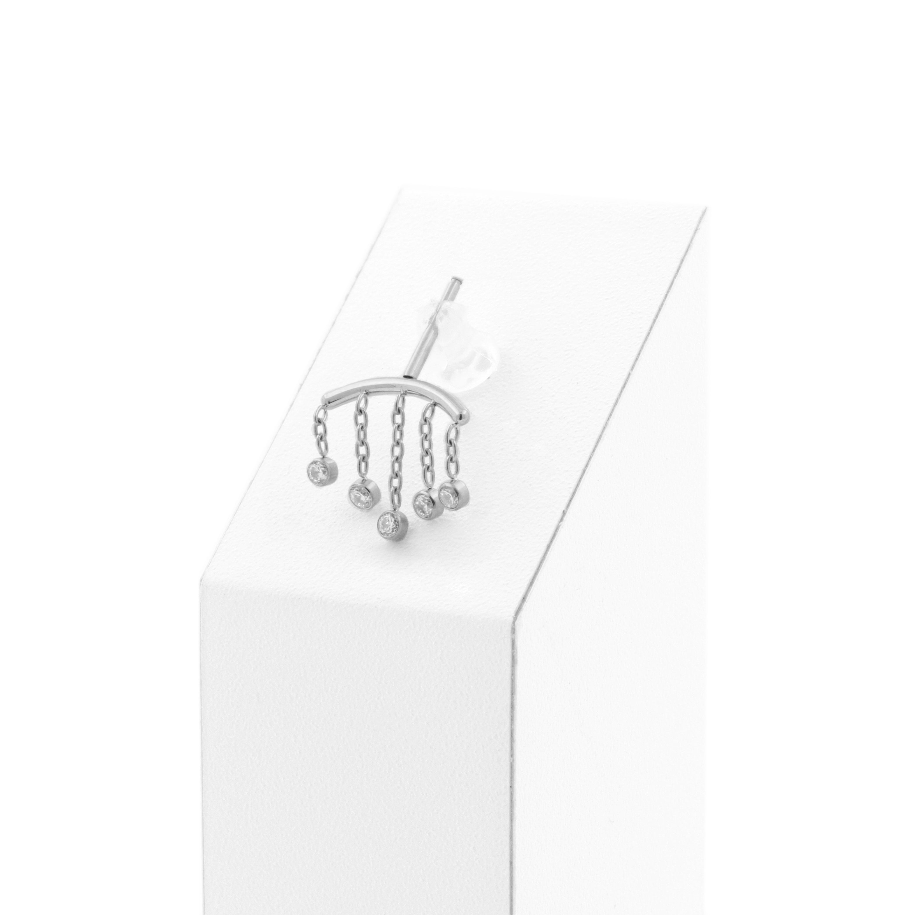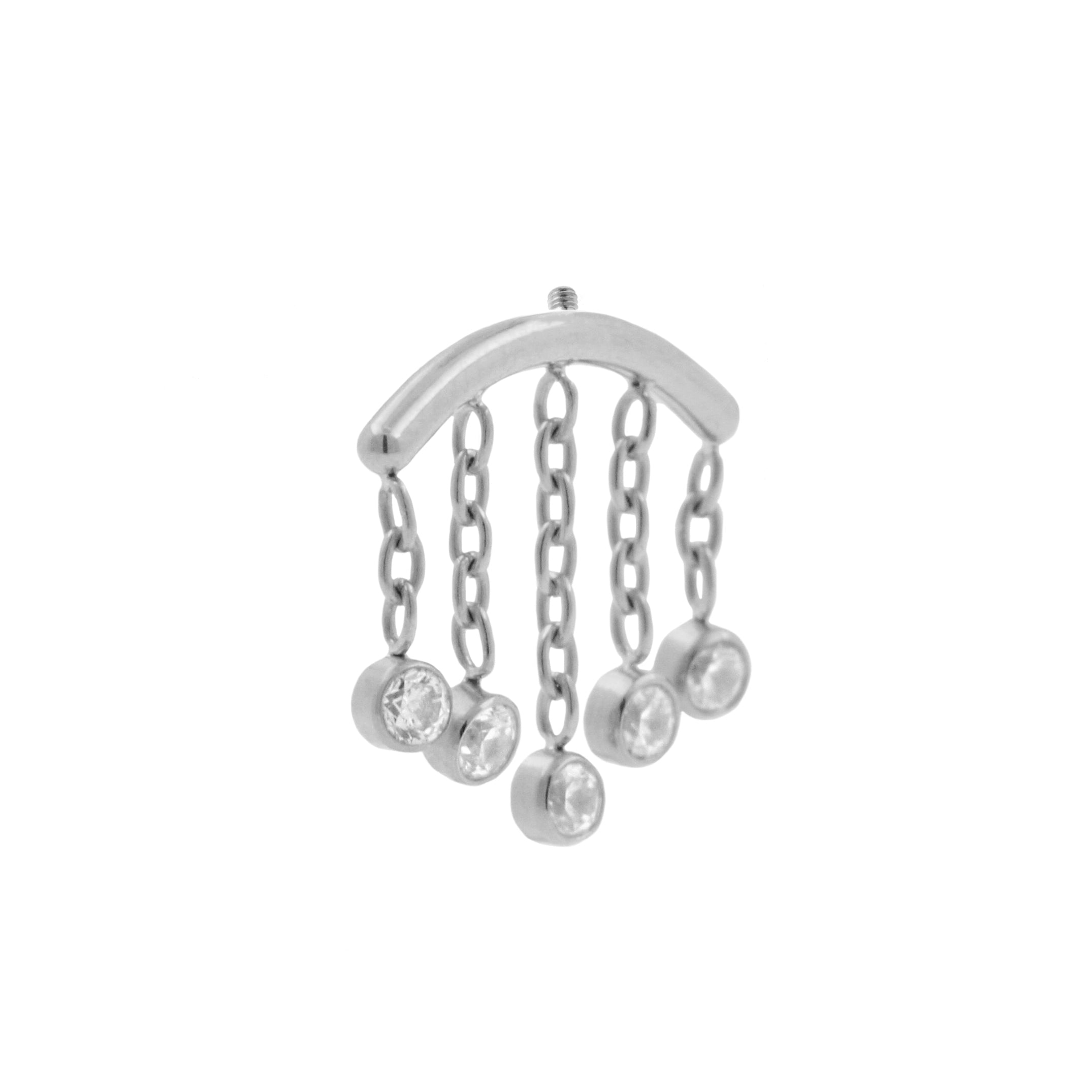 Titanium vertical helix curve met zilverkleurige PVD CoCr-coating met de glans van witgoud (nikkelvrij), voorzien van bungelende clear cubic zirconia. Internally Threaded, geschikt voor 1,2 mm staafjes. Per stuk geleverd, alleen de top (staafjes los verkrijgbaar).